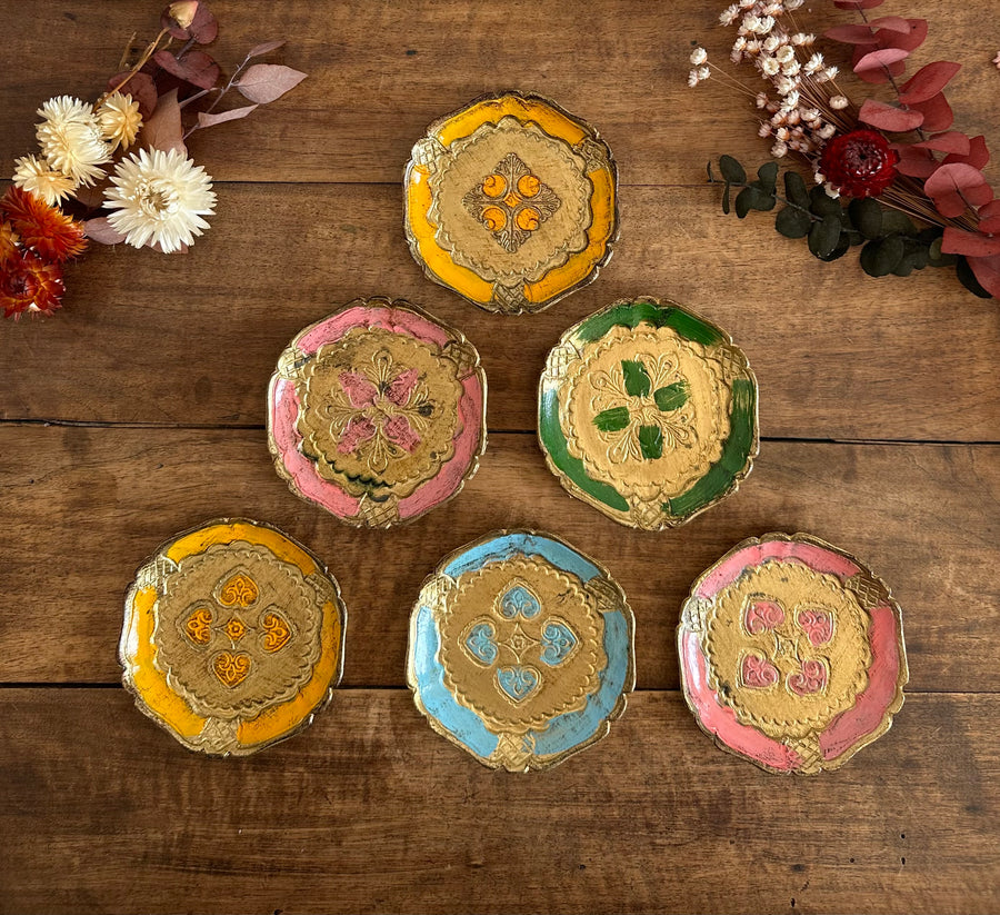 Ravissant ensemble de six sous-verres colorés style florentin. Plastique coloré. Lot de 6 vendus ensemble. De jolis traces du temps.