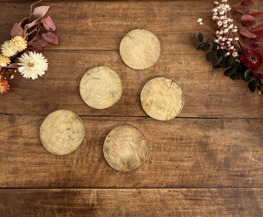 Joli lot de 5 sous-verres en nacre cerclés de laiton. Recto en liège. Estimation années 70. Vendus ensemble