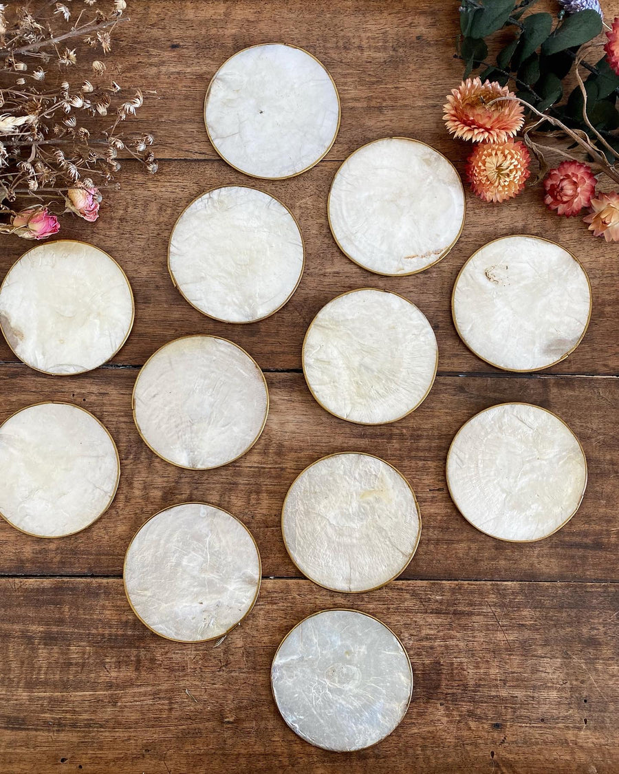 Série de 12 jolis sous-verres en nacre cerclée de laiton avec leur dessous en liège. Parfaitement imparfaits, datant des années 70. Très chics sur votre table à l’heure de l’apéritif. À adopter de toute urgence.
