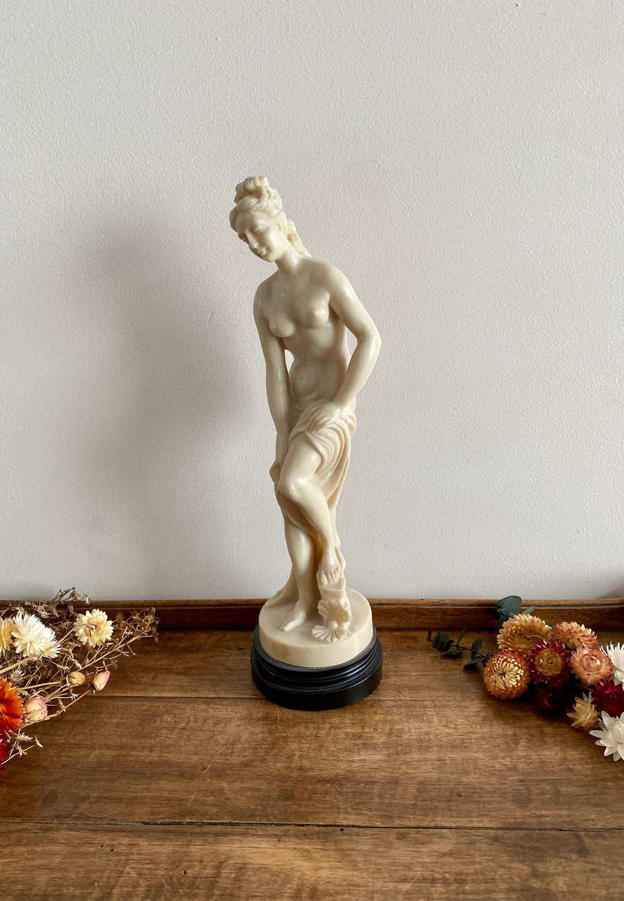 Statuette Vénus sortant du bain en résine sur socle noir en bois