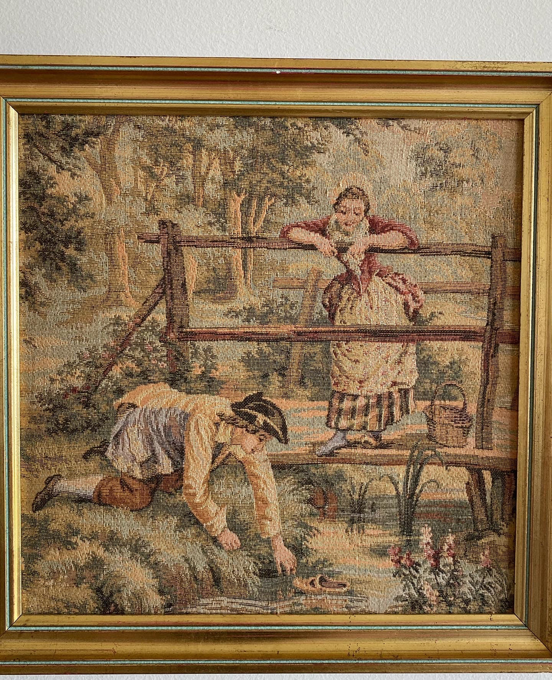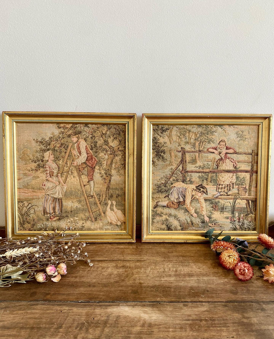 Deux jolis cadres en bois doré présentant des scènes champêtres d’Autrefois sur une tapisserie ancienne.