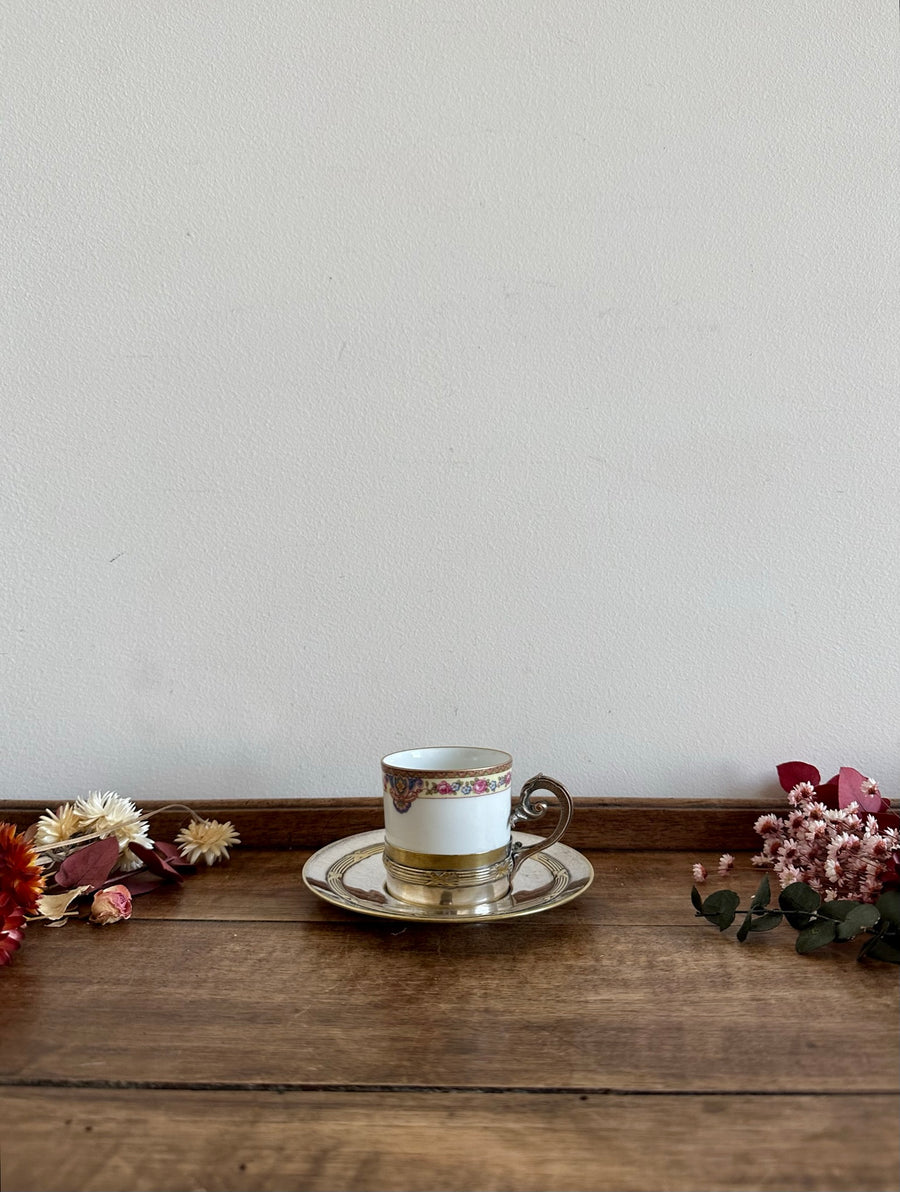 Ravissante petite tasse en porcelaine de Limoges années 30, dotée d'un porte tasse en métal argenté et de sa soucoupe assortie. Pour donner du panache à votre expresso !