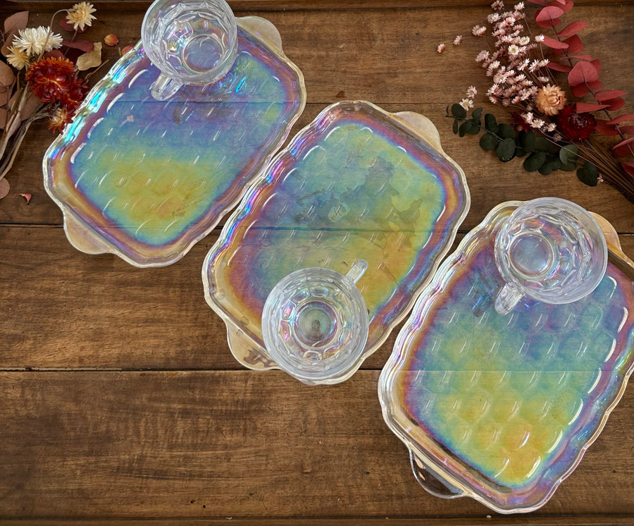 Alerte coup de coeur ! Adorable lot de 3 tasses et plateaux assortis en verre irisé. Idéal pour servir un café gourmand ou un petit déjeuner. Vendus ensemble