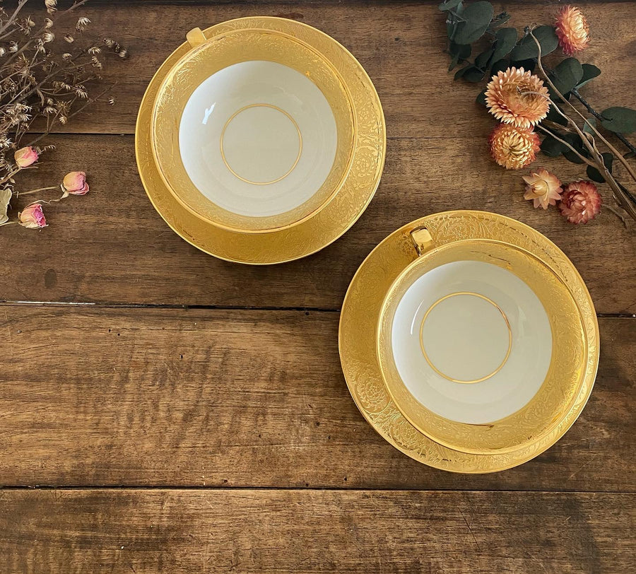 Envie d'un chocolat chaud de princesse ? Voici deux grandes tasses XL avec leurs soucoupes assorties en porcelaine de Limoges blanches et or gravées et signées Bernardaud & cie. Elles dates des années 1920.