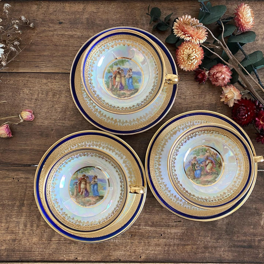 En porcelaine blanche nacrée avec leurs jolis gallons bleus et or et leur représentation d'époque.
