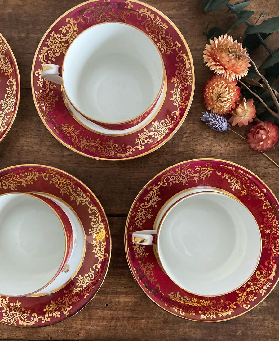Jolies petites tasses à café très anciennes en porcelaine de Limoges France, de couleur rouge grenat ornées d’une frise dorée.  L’intensité des couleurs peut parfois être  inégale, ancienneté oblige! mais cela n'ôte rien à leur charme.