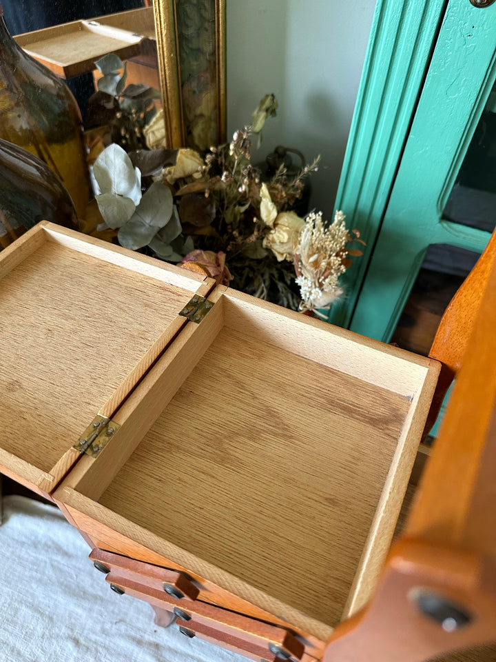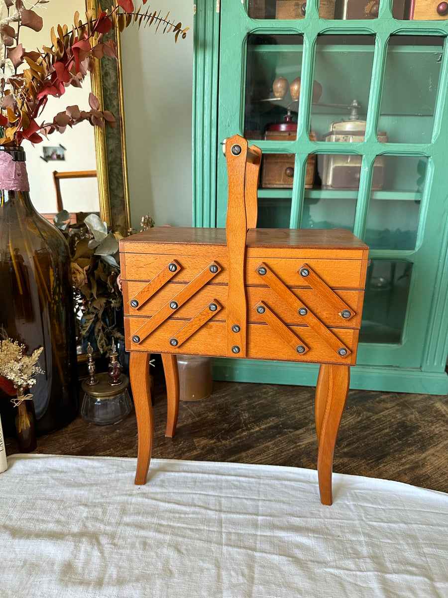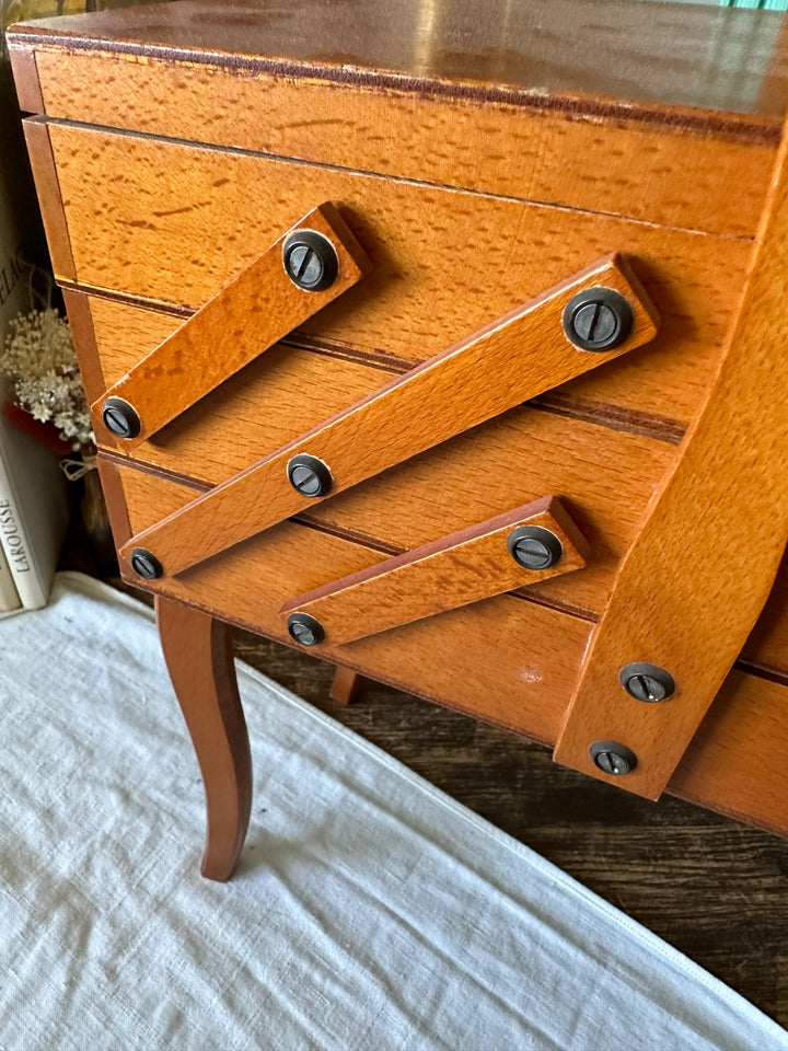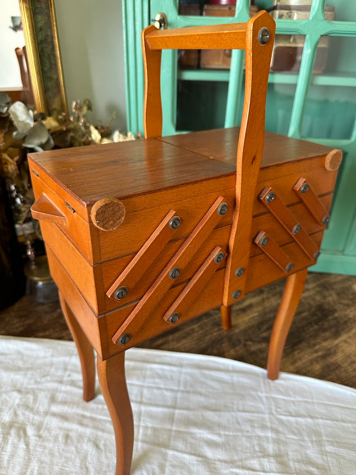 Adorable petite travailleuse sur pieds en bois. Estimation années 60. On remarque un léger petit rehaussement effectué sur l'un des quatre pieds pour la rendre stable