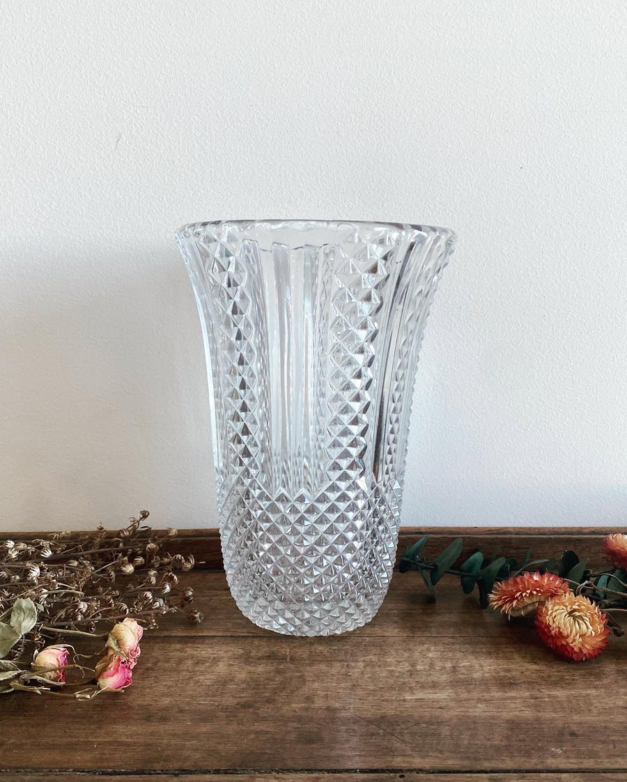 Sublime vase ancien en cristal taillé, original par sa forme évasée et ses pointes de diamants.