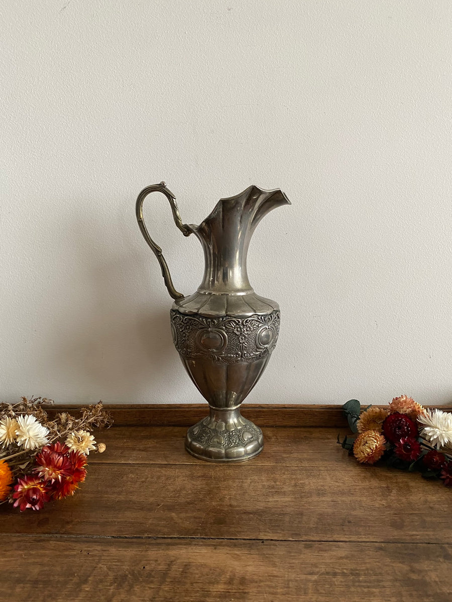Beau vase en métal argenté orné de fleurs sculptées. Belle patine.