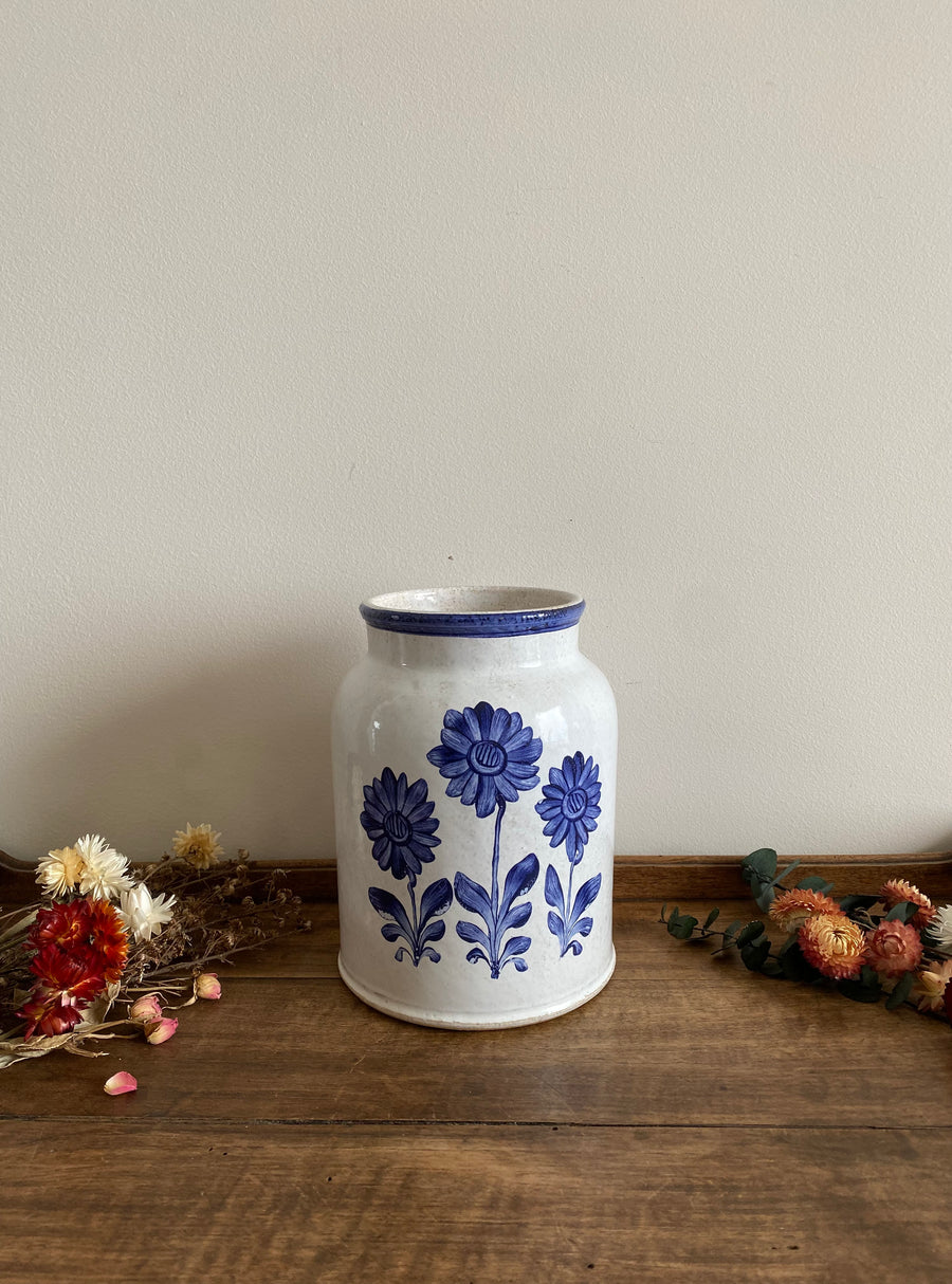 Joli pot en céramique blanche décoré de trois marguerites bleues.