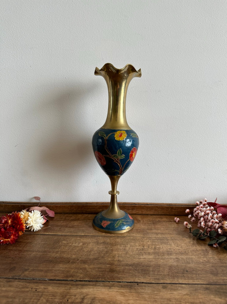 Ravissant vase en laiton émaillé à collerette, décoré de jolies fleurs roses, rouges et jaunes sur fond bleu.