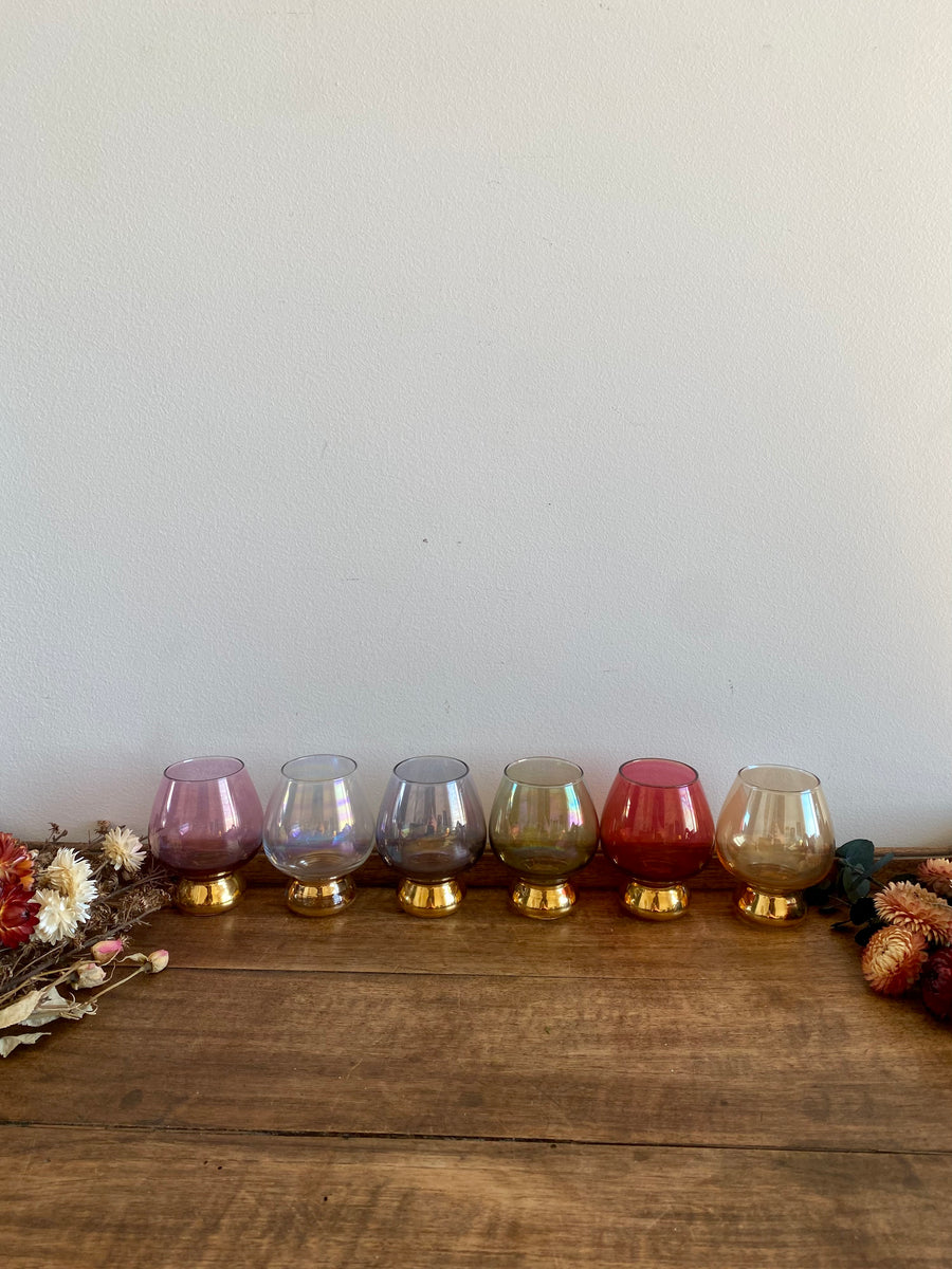 Adorable set de 6 verres à cognac colorés (ou autre liqueur !) au reflet irisé avec leurs jolis pieds ronds dorés.