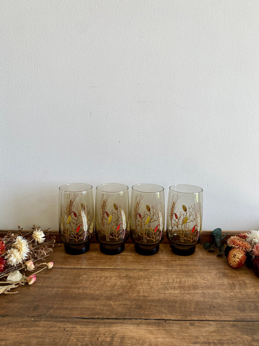 Joli lot de 4 verres à orangeade en verre fumé avec leurs motifs champêtres.