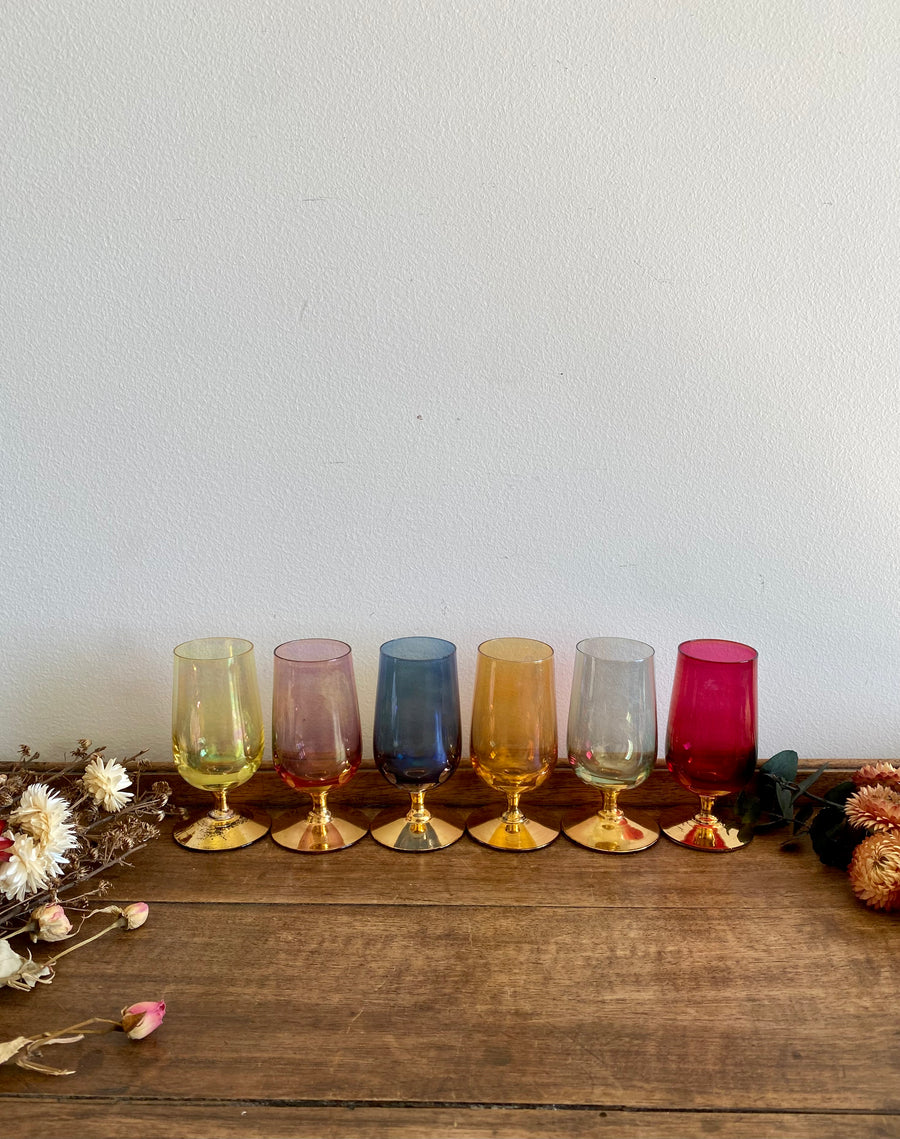 Ravissant ensemble de 6 petits verres à liqueur multicolores sur pieds dorés.