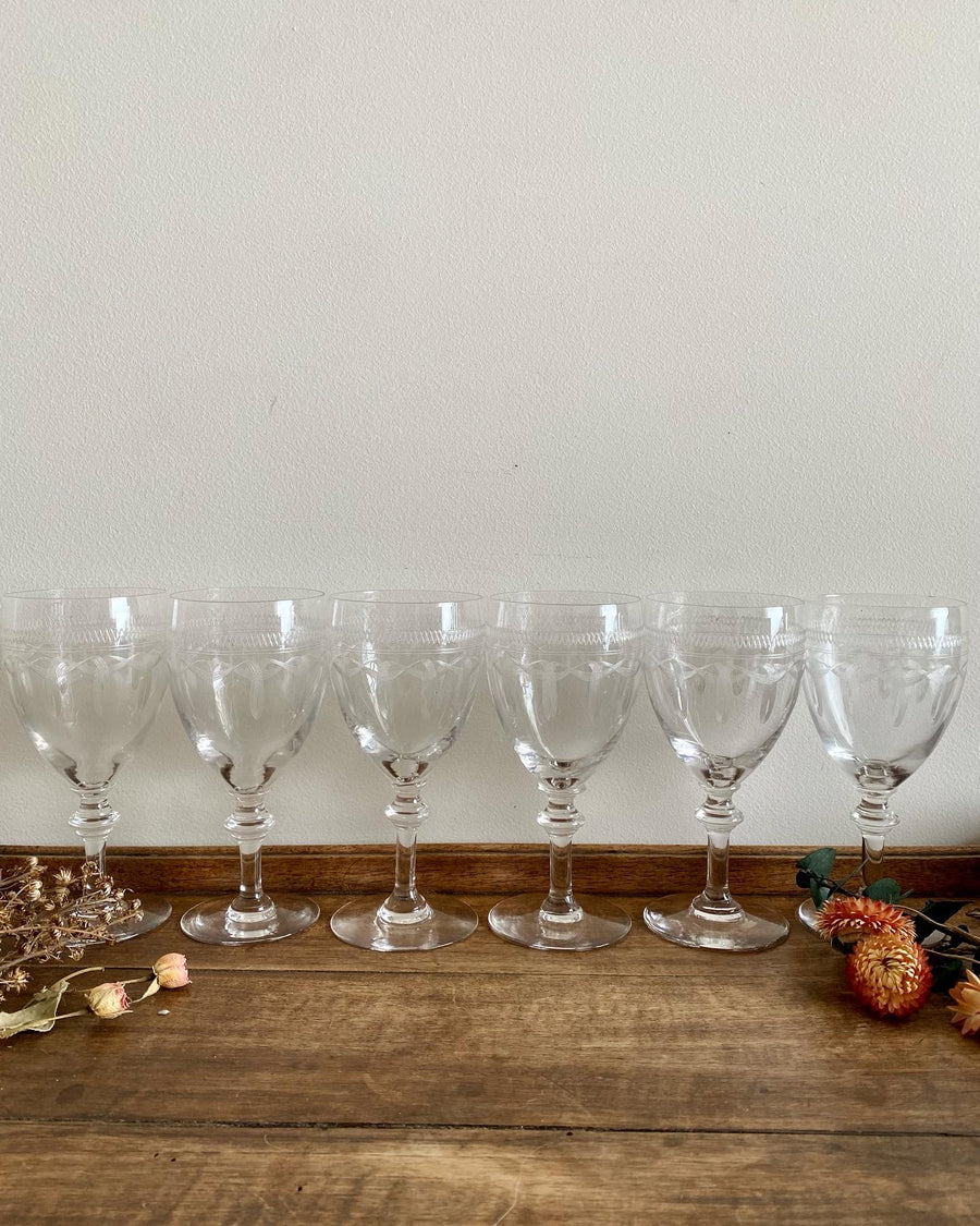 Lot de 6 verres à vin en cristal avec leurs frises décoratives délicatement gravées.