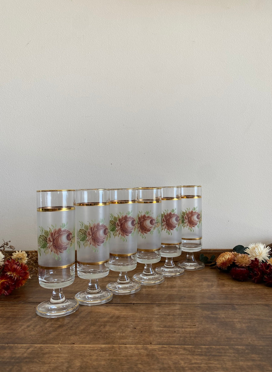 Élégant service de 6 verres à pied en verre dépoli aux motifs fleuris. Années 50.Signés Giorgi.Vendus ensemble.