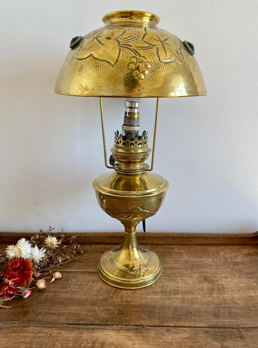 Belle lampe à pétrole Parisienne électrifiée. Sublime composition en laiton doré ornée de petites pierres vertes fantaisie qui se reflètent sur le mur lorsque vous l'allumez - C'est simple, nous l'adorons !
