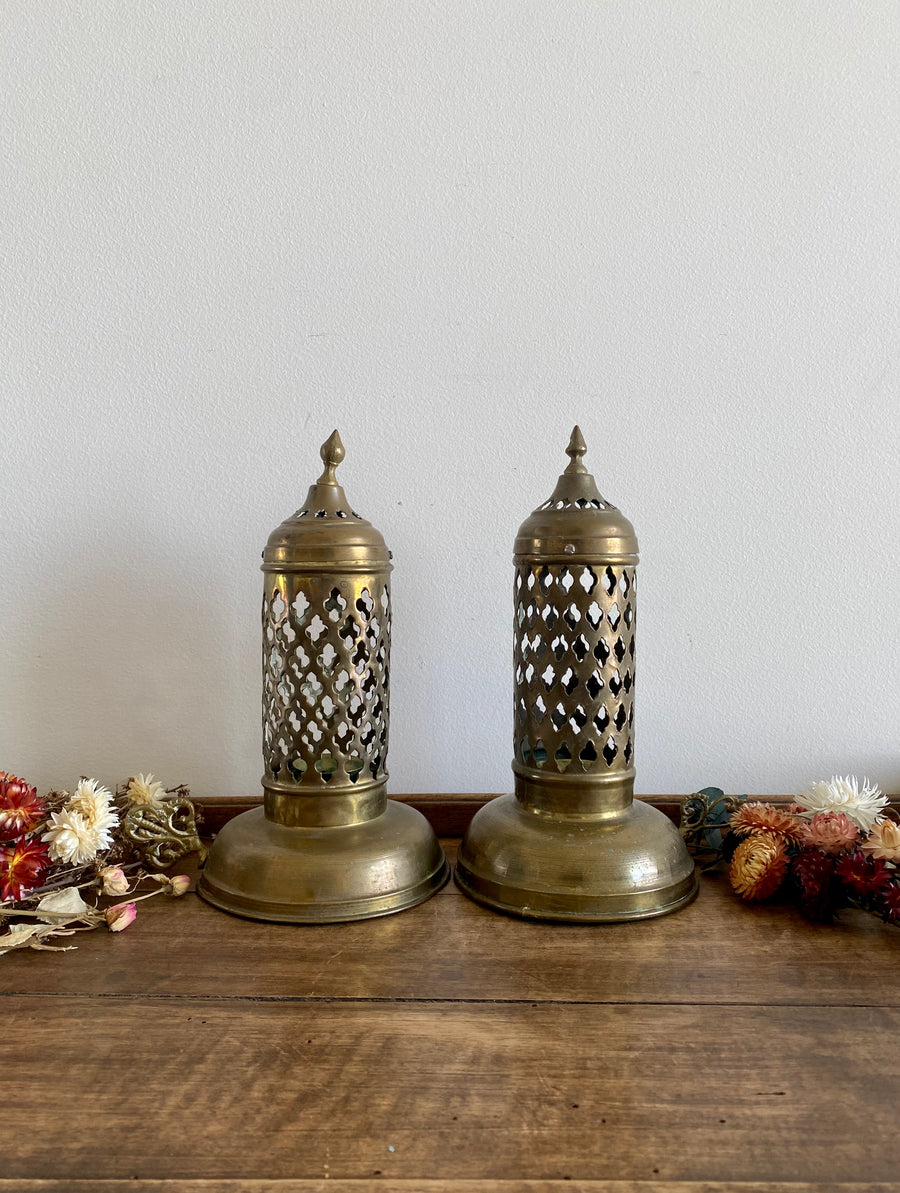 Paire de deux beaux bougeoirs ajourés en laiton doré.