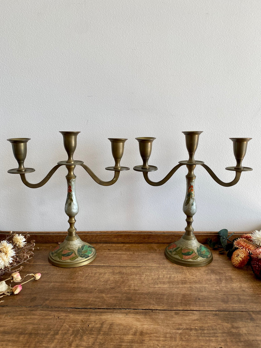 Lot de deux chandelier à trois têtes, en laiton émaillé