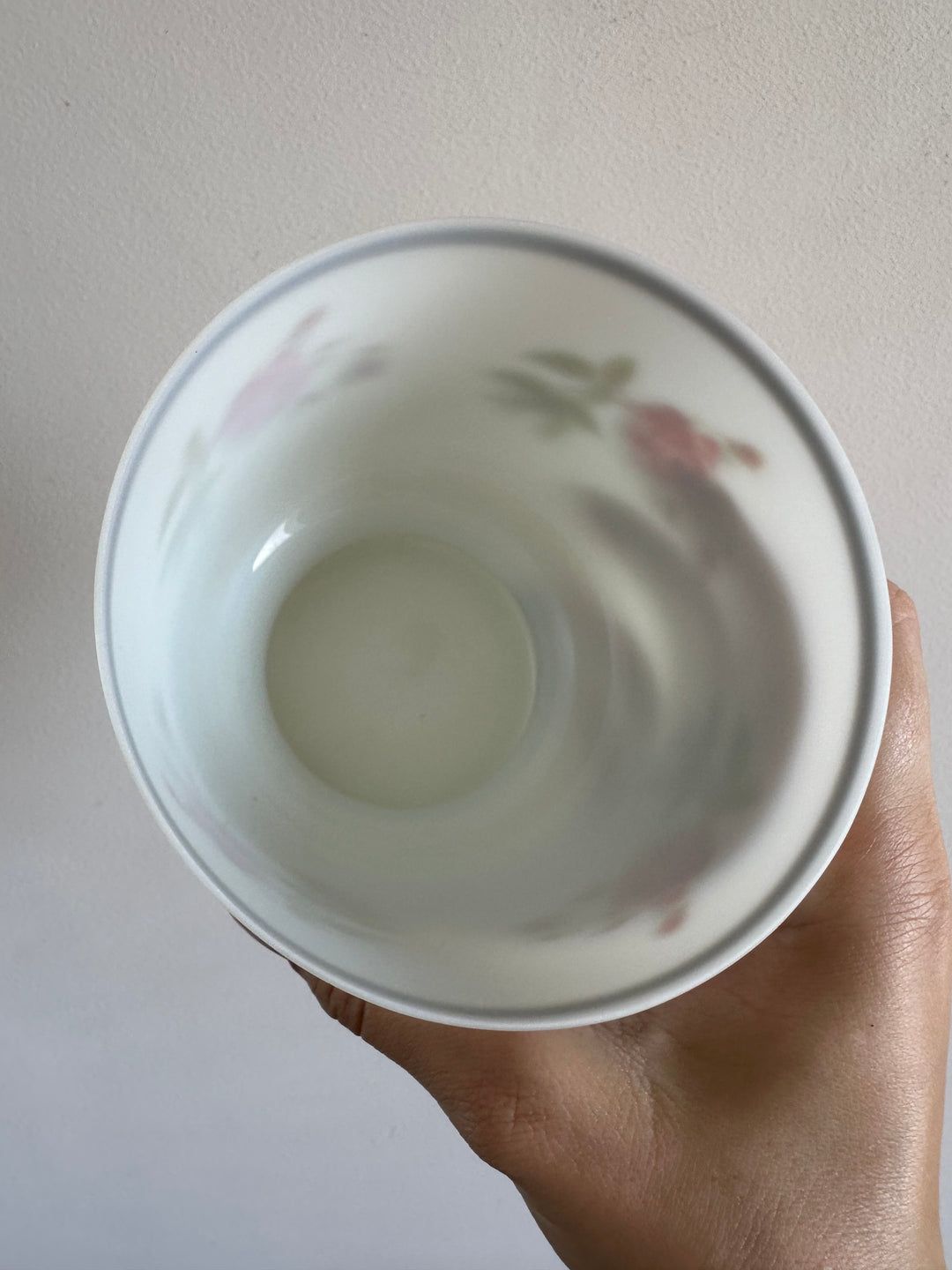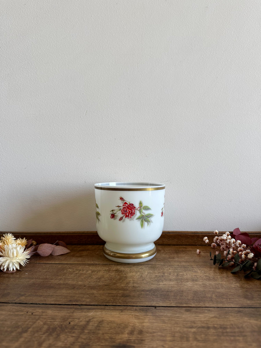 Charmant cache-pot en opaline blanche décoré de roses rouges. Pourra également servir de vide poche. Estimation années 50.