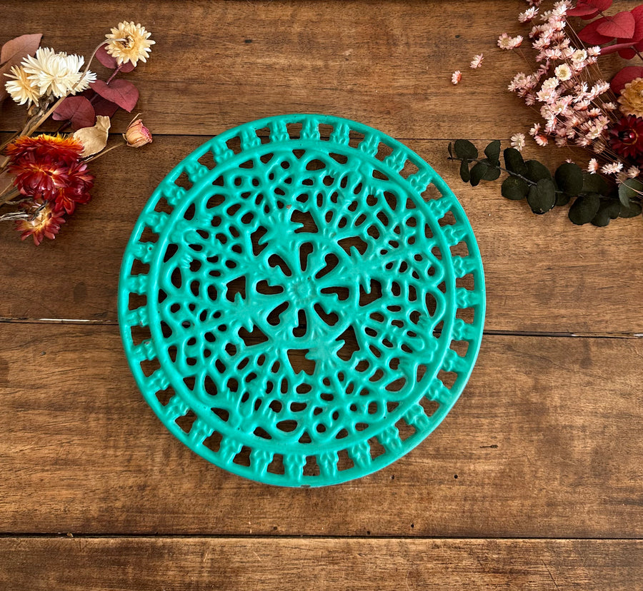 Ravissant dessous de plat en fonte rond de couleur vert turquoise. Apportera un souffle printanier à votre cuisine