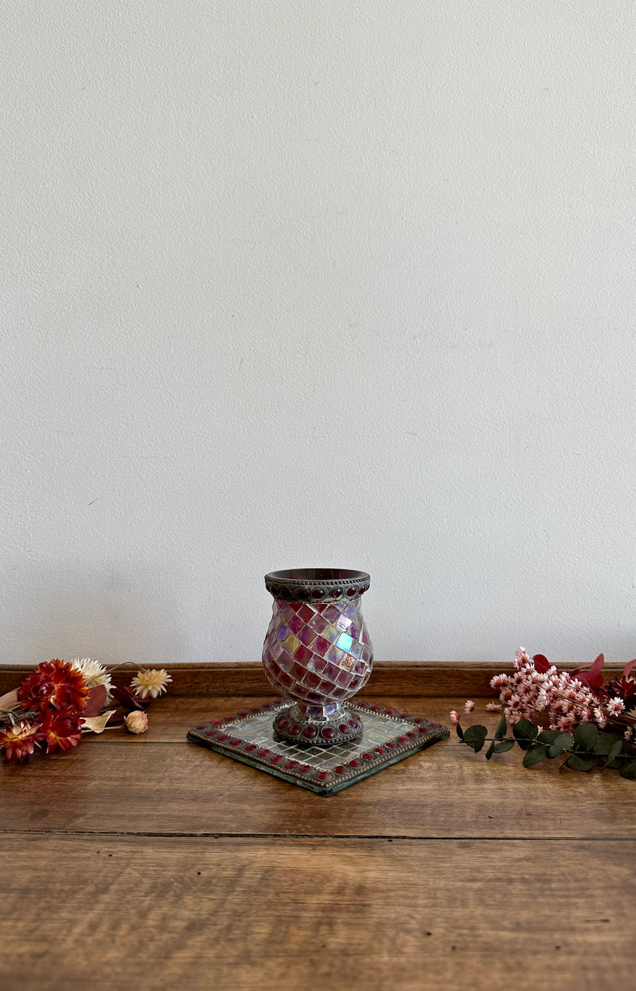 Adorable petit photophore en pâte de verre aux tons rouges et camaïeux de violet. Support carré plat en mosaïque assorti. Objet absolument imparfait comme on les aime