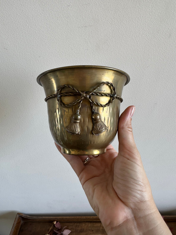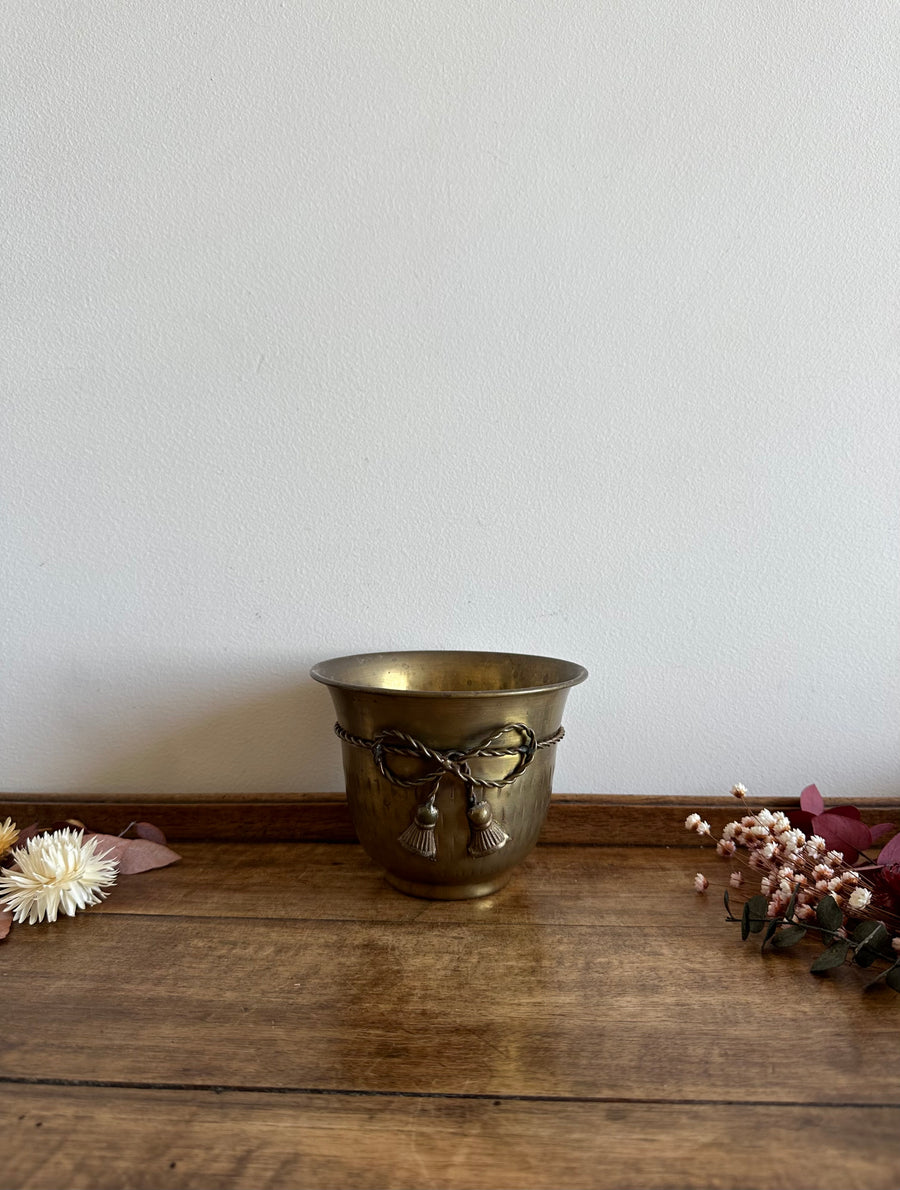 Charmant petit pot en laiton doré décoré d'un noeud cordé. Pourra servir de vide poche ou de cache pot. Estimation années 60. De jolies traces du temps