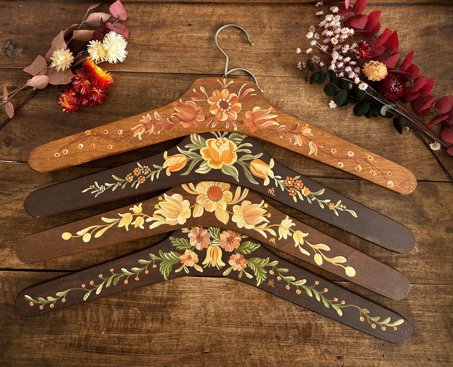Charmant lot de 4 cintres en bois. Jolies décorations florales peintes à la main et signées. Vendus séparément. Estimation années 80.