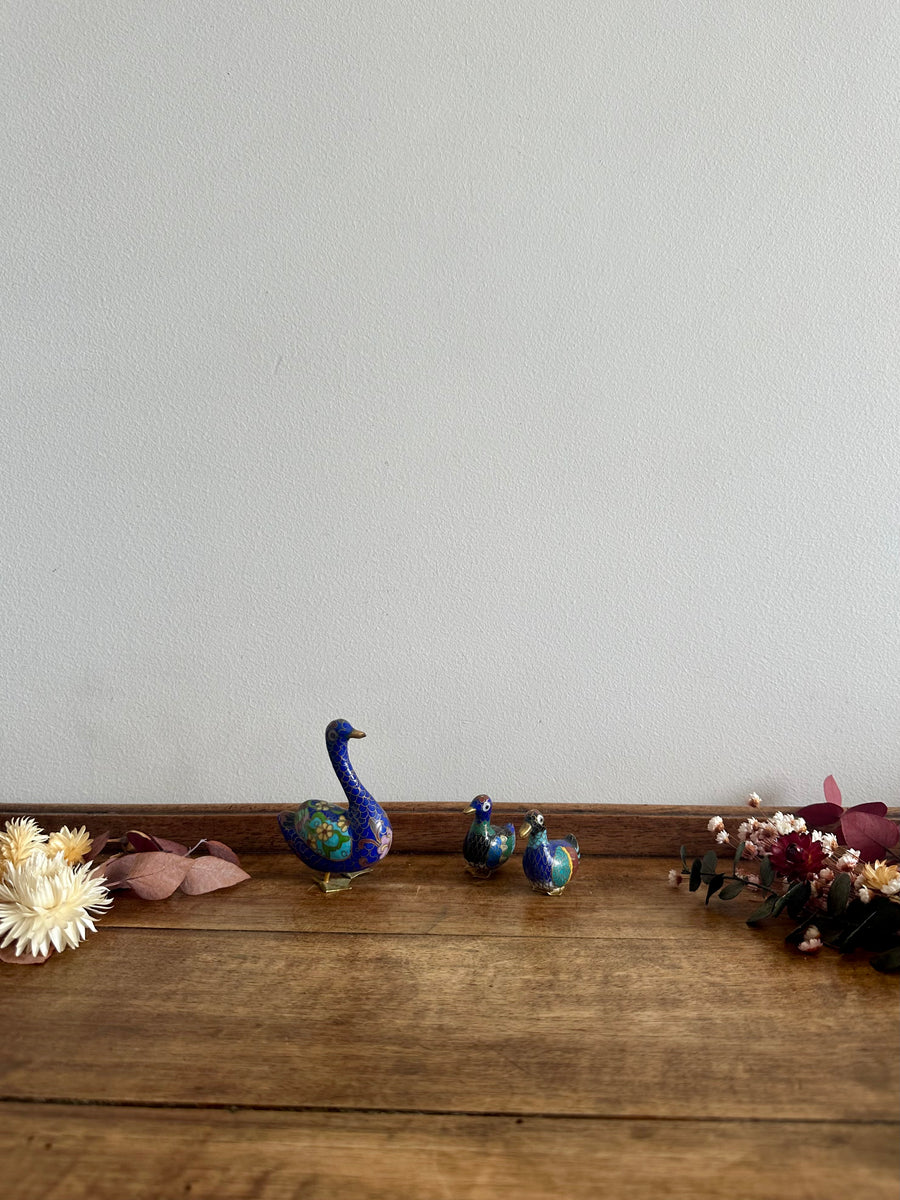 Adorable trio de petits canards en laiton émaillé cloisonné. Objets anciens et imparfaits. Vendus ensemble