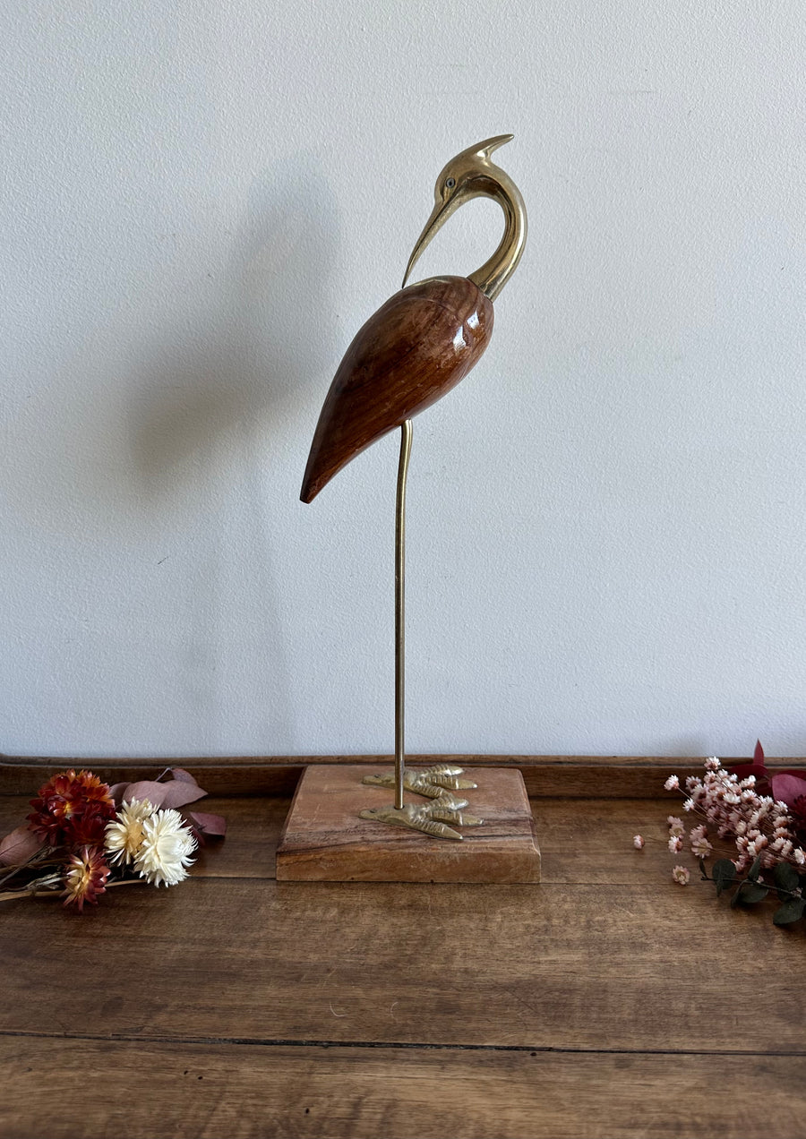 Charmant héron en bois et laiton ancien. Objet déco vintage comme on les aime ! A noter, objet ancien comportant de petites traces du temps visibles sur les photos. Estimation années 60;