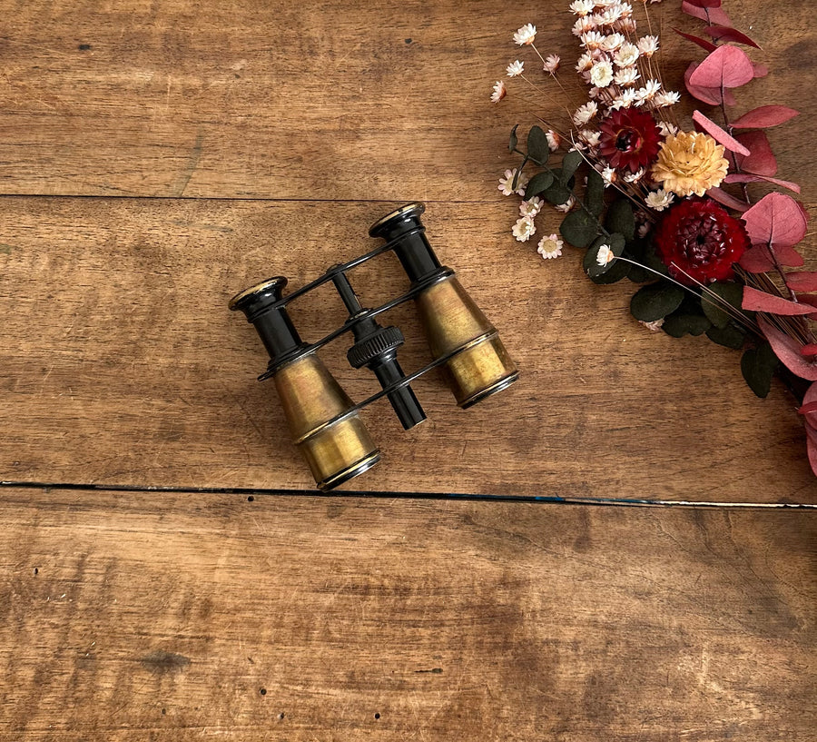 Charmante paire de jumelles militaires en laiton. Estimation années 1900-1910; Inscriptions gravées : Duval Ainé Annecy, Jumelle Militaire. Mention spéciale pour l'adorable petite boussole située au centre.