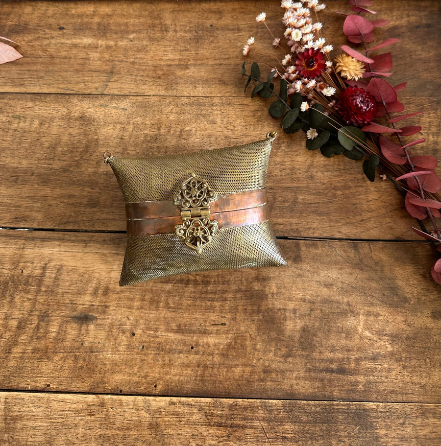 Coup de coeur pour cette adorable petite minaudière en cuivre et laiton. Chainette d'origine, intérieur en velours bleu. Estimation 19ème.