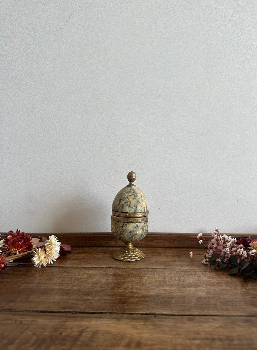Elégant petit oeuf décoratif marbré. Armature en bronze, pied en métal doré. Estimation années 50. Il est possible qu'il s'agisse d'un ancien petit briquet de table. Vous pourrez l'utiliser en décoration ou y ranger vos petits bijoux.