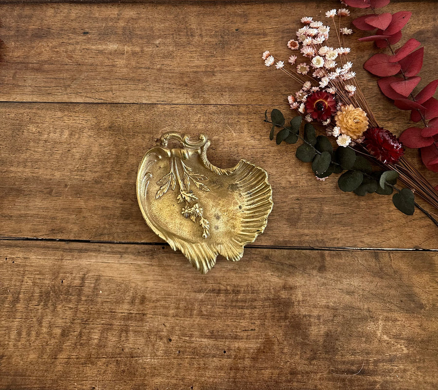 Joli vide poche en laiton. On aime les détails de sa décoration florale et ses jolies courbes. Estimation années 50.