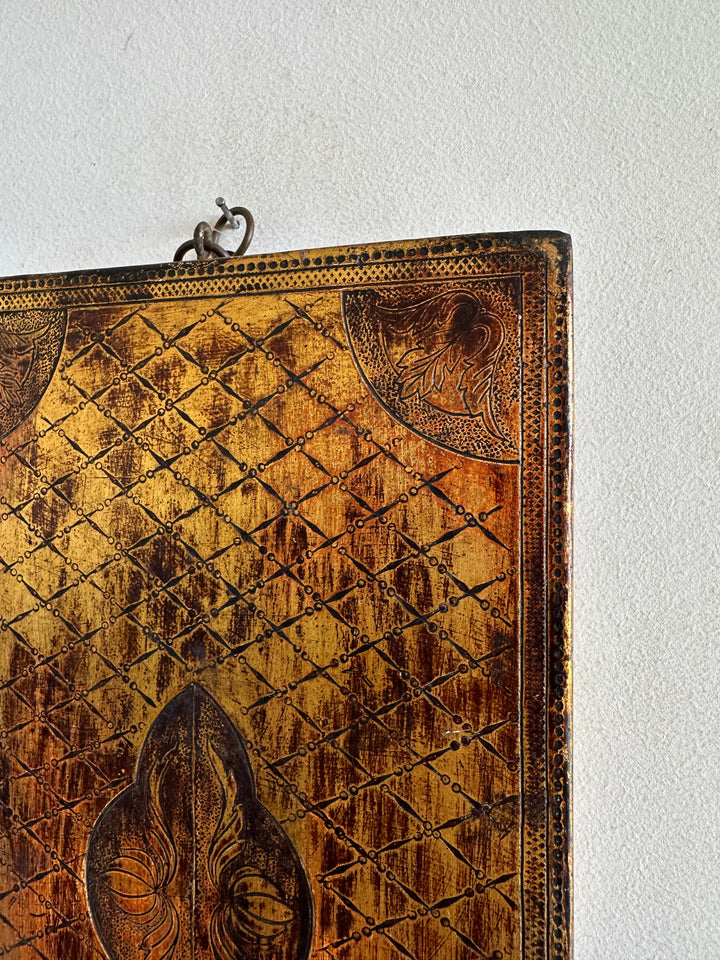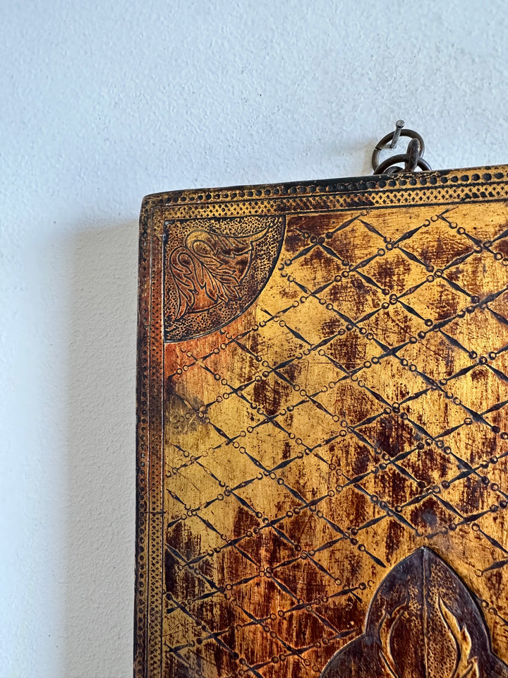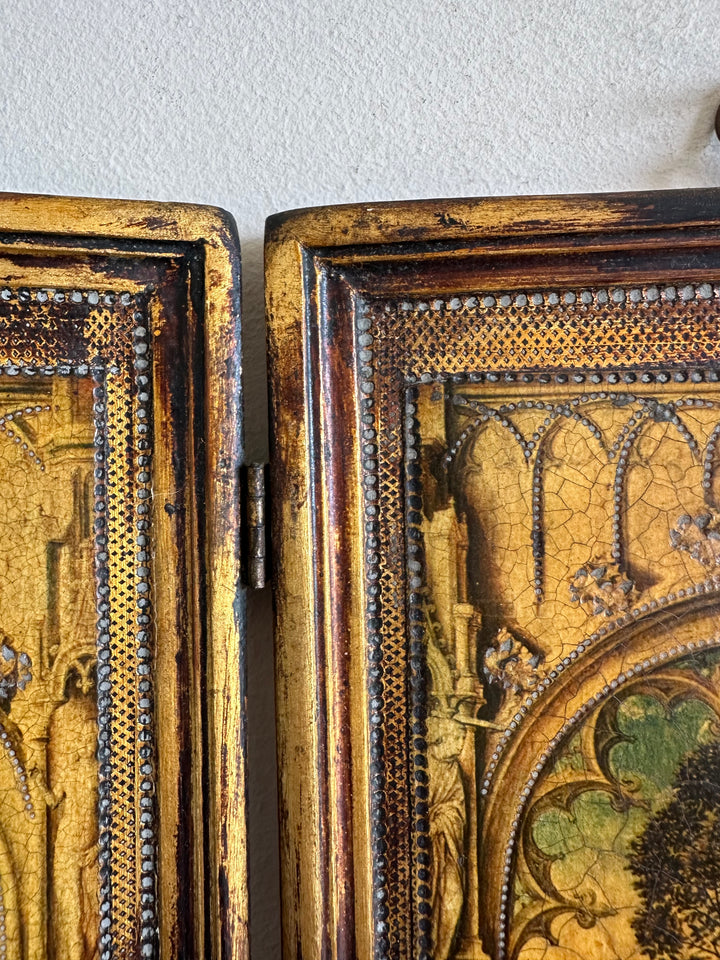Elégant diptyque religieux en bois. Représentation de Saint Jean Baptiste et Sainte Véronique. D'après l'oeuvre de Memling. Un très bel objet. On aime les délicates frises gravées qui la décorent. Estimation début XXème