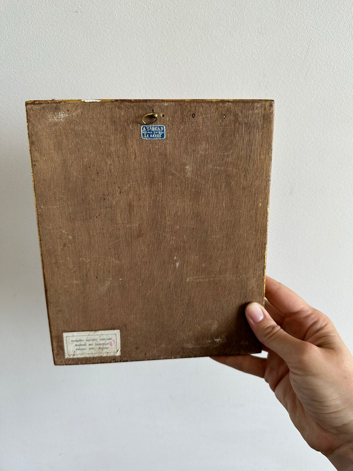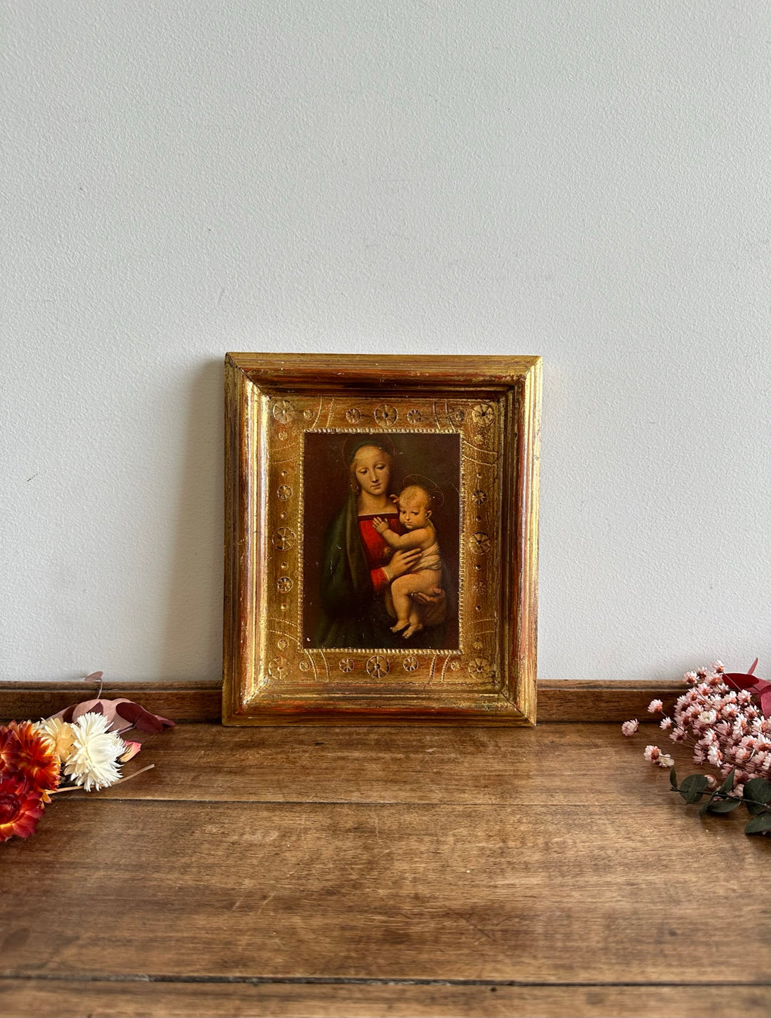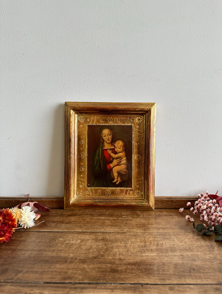 Belle icône religieuse de style Florentin en bois doré. Représentation de la Madonna del Granduca de Raffaello Sanzio. Estimation années 1920. Objet imparfait présentant de jolies traces du temps.