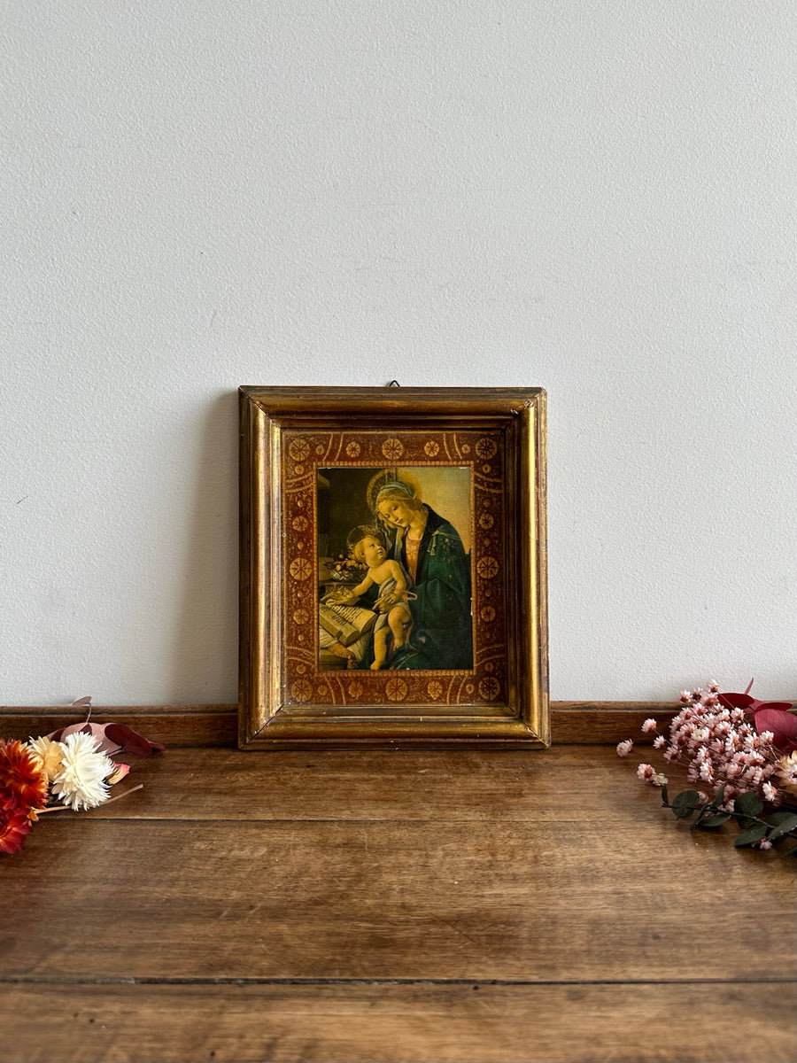 Belle icône religieuse de style Florentin en bois doré. Tons or marrons. Représentation de Sandro Botticelli, La Virgine del libro. Estimation années 1920. Objet imparfait présentant de jolies traces du temps.