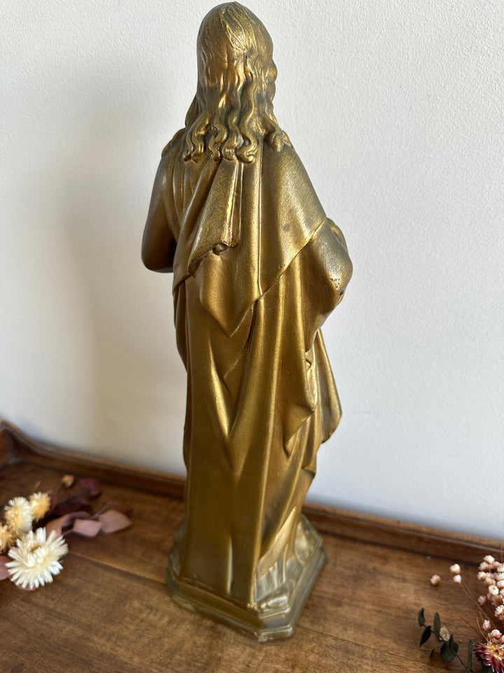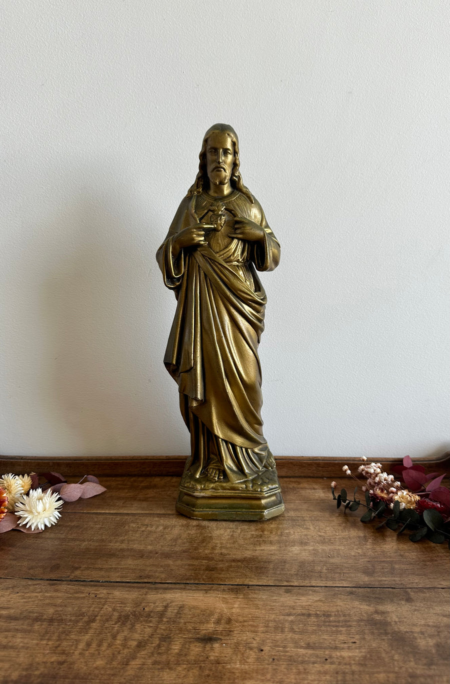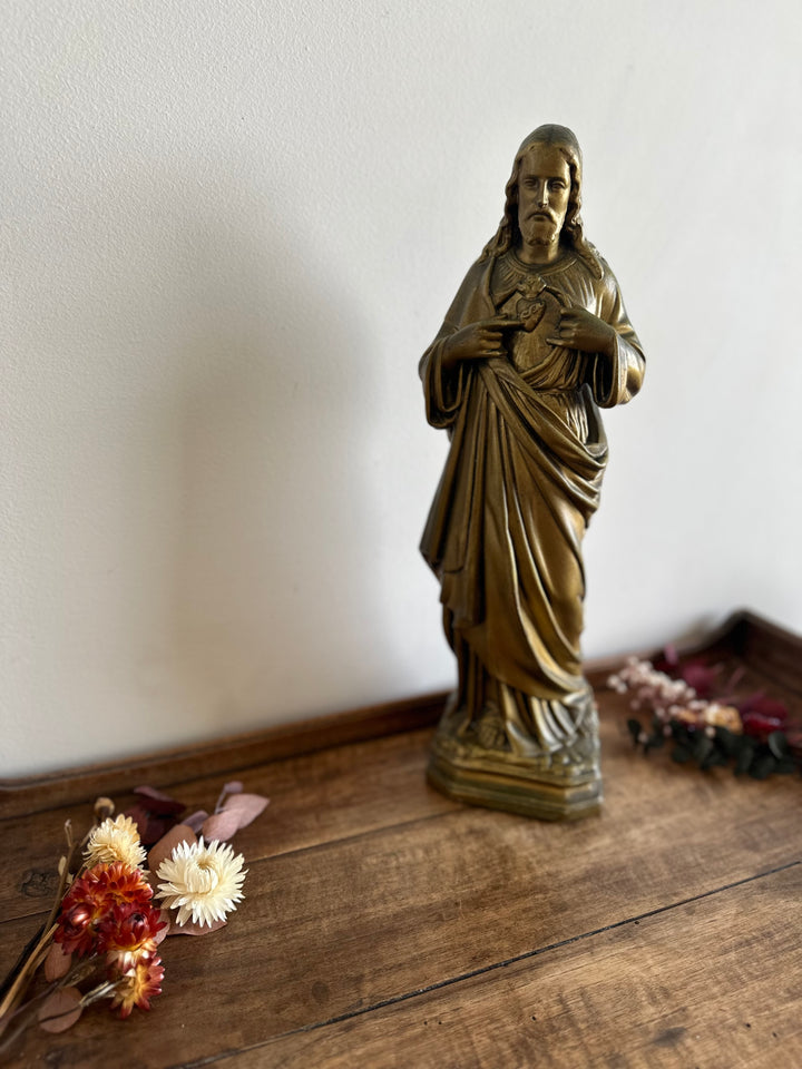 Belle statue du Sacré Coeur en plâtre peinte en doré. Estimation annees 50. On aime particulièrement sa belle couleur mordorée. Objet ancien et imparfait comme montré sur les photos.