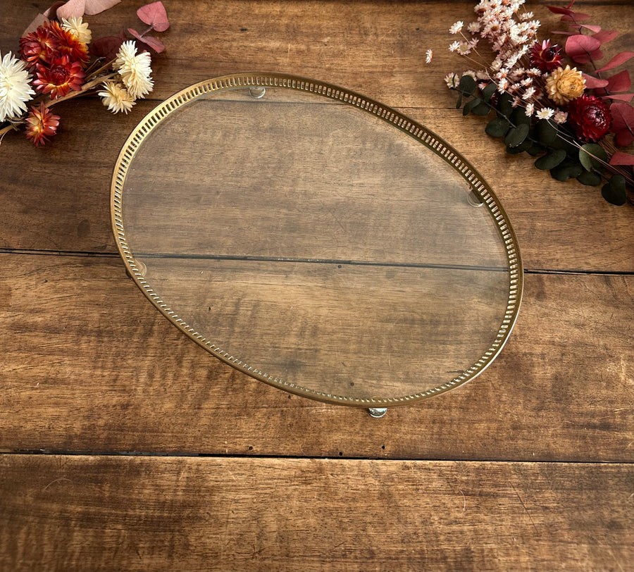 Charmant plateau de présentation sur pied en verre époque napoléon III. Cerclé de laiton. Idéal pour décorer votre salle de bain ou votre coiffeuse. Estimation début XXème.