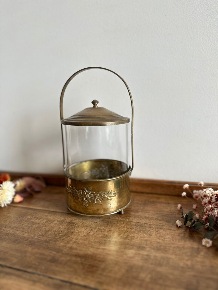 Charmante boîte à biscuits en laiton et verre dotée d'un couvercle et d'une anse. On aime sa belle patine. Estimation années 20.