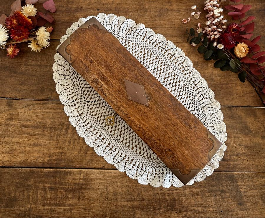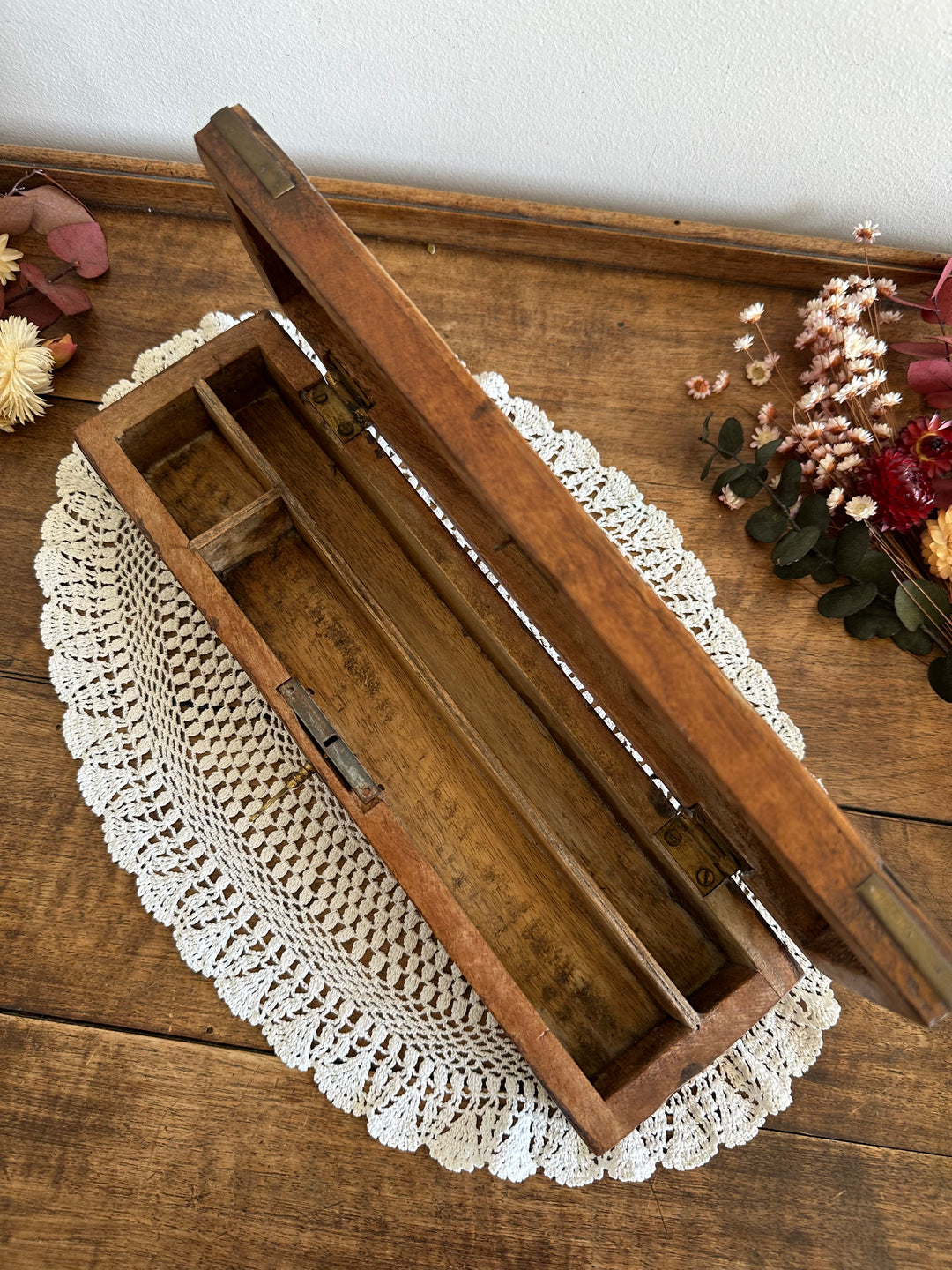 Charmante boîte en bois compartimentée ornée de laiton. Bonus ! Cette jolie boîte dispose toujours de sa clé d'origine. Estimation années 60.