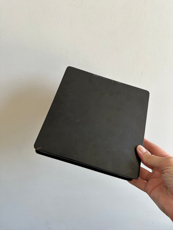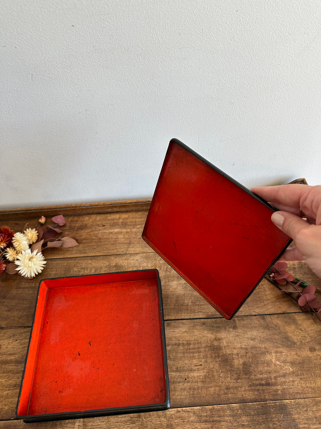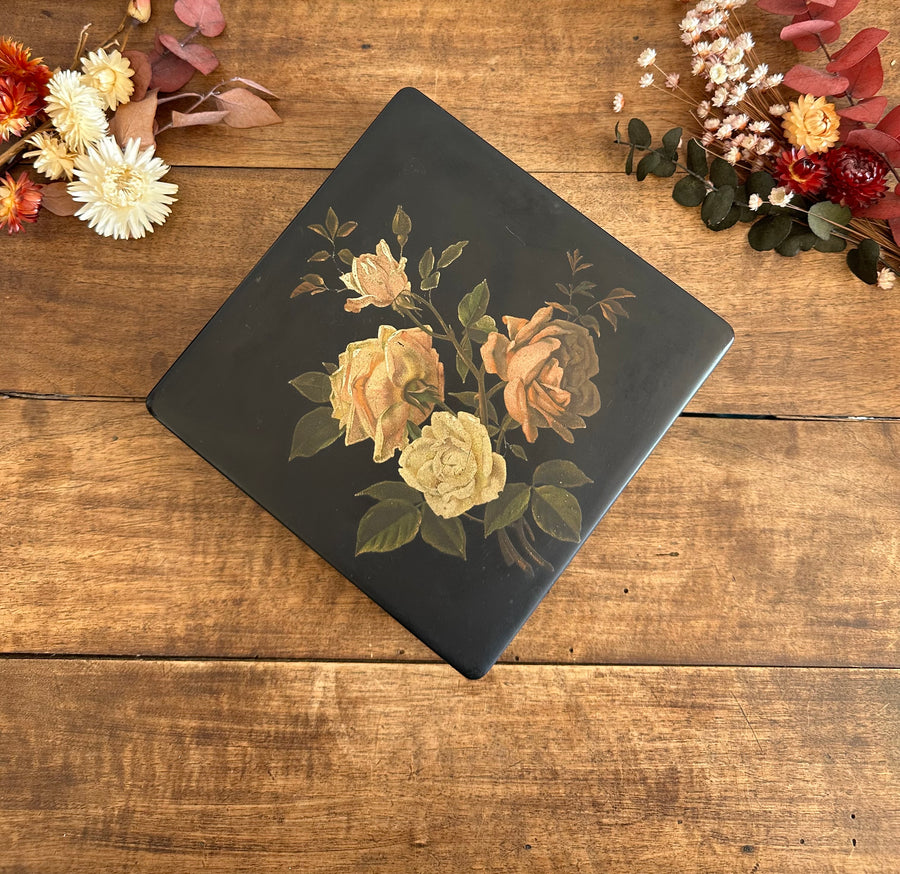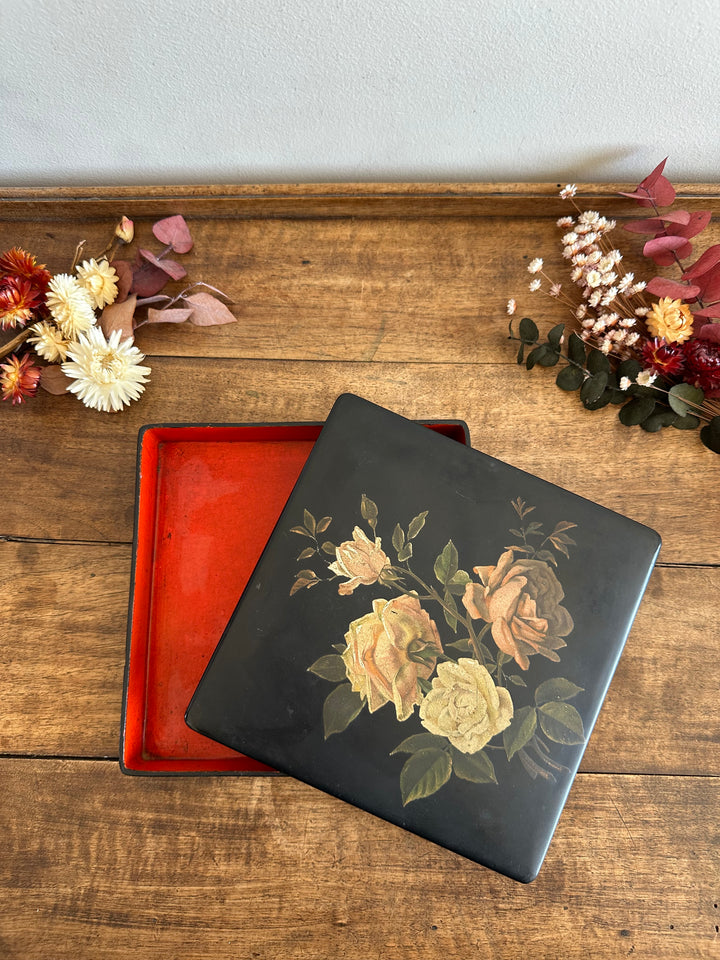 Belle boite carrée en bois laqué noir. Jolis motifs roses. Intérieur rouge laqué. Estimation années 50.