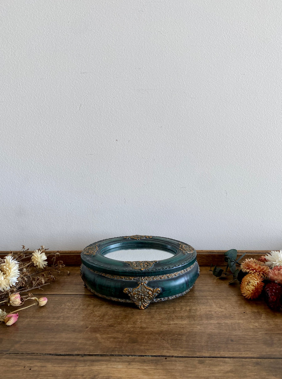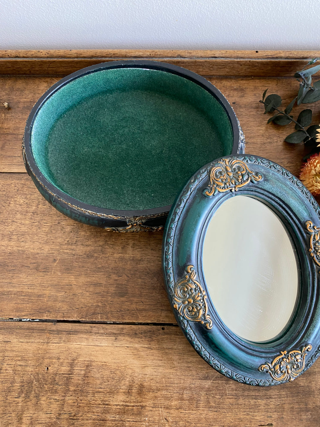 Charmante petite boite en bois peinte en vert avec ses moulures dorées. Dotée d'un miroir ovale sur le couvercle et de 4 petits pieds.
