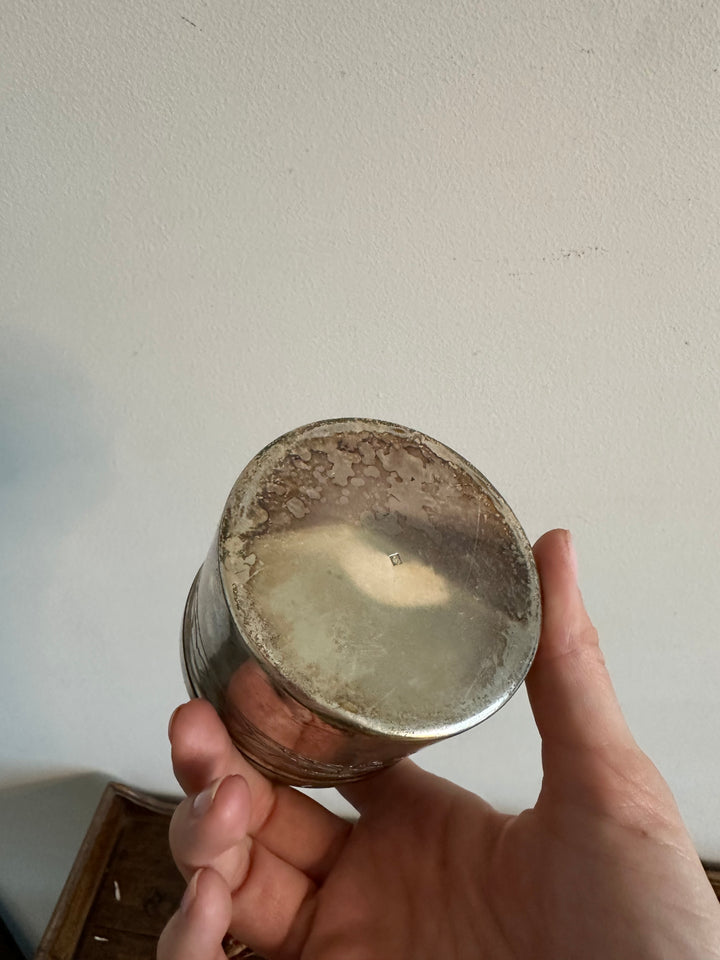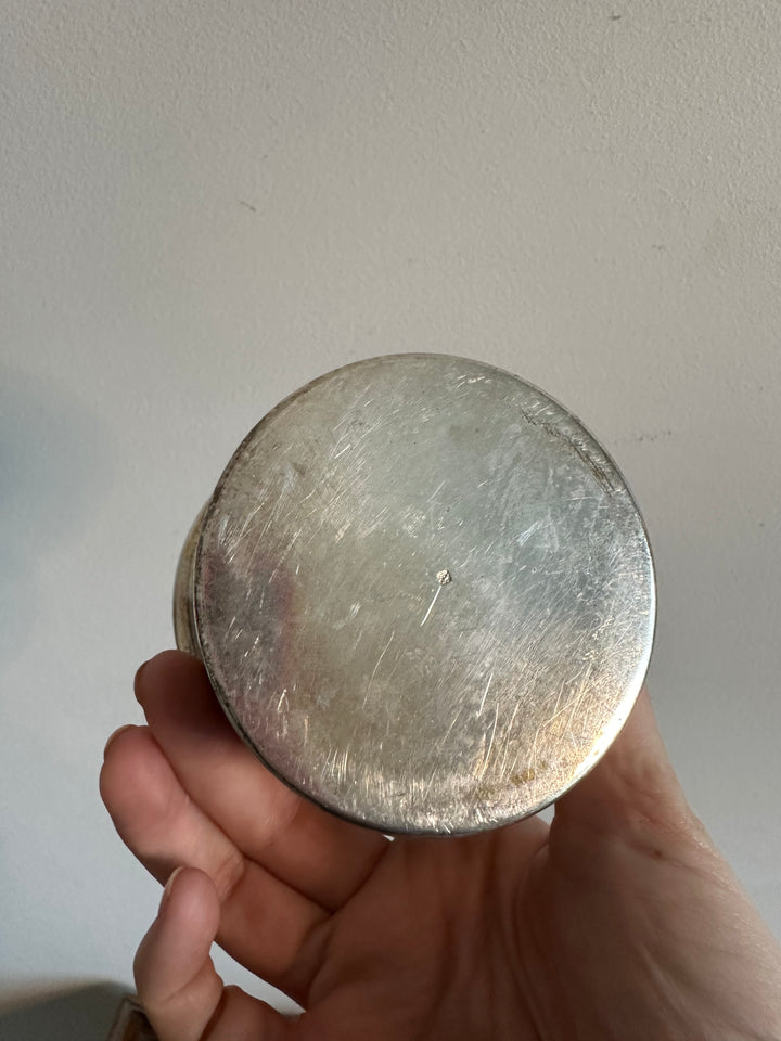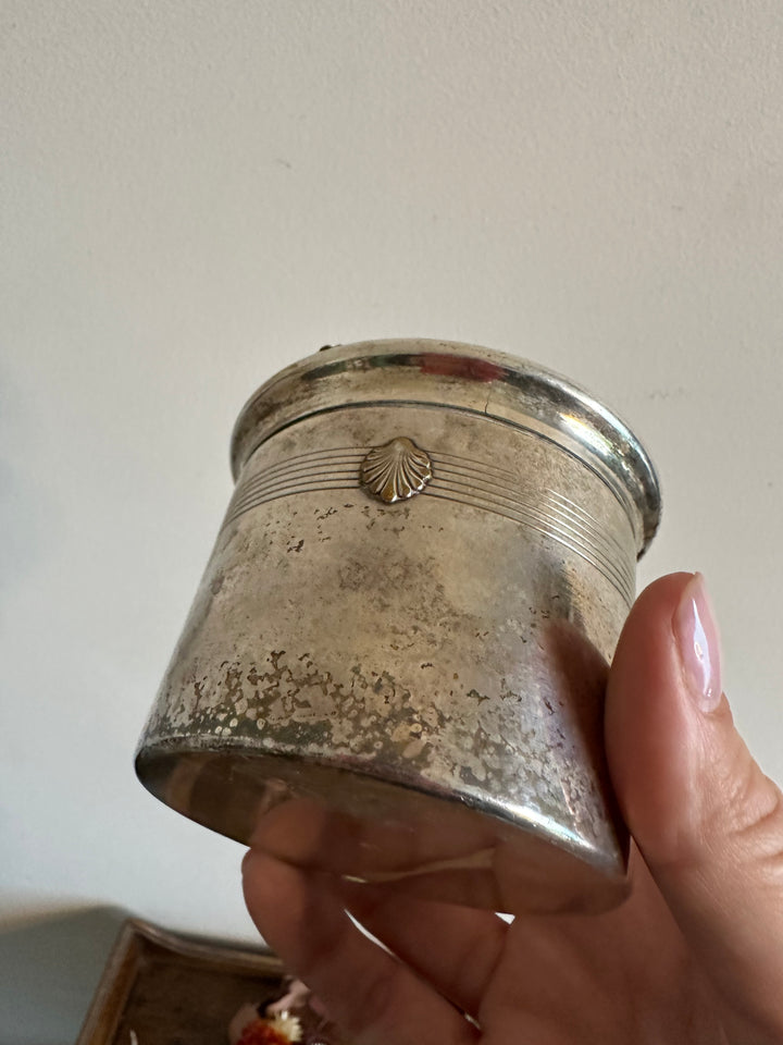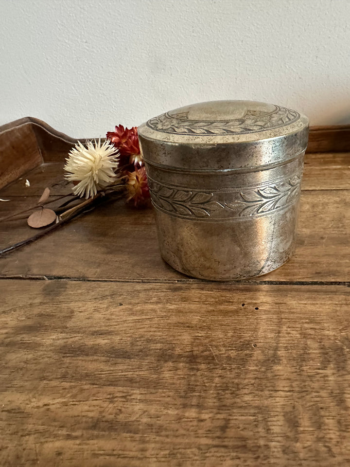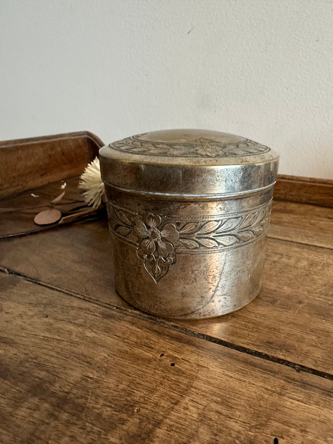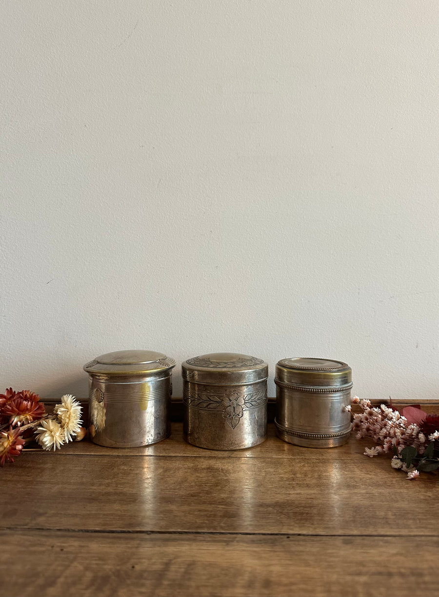Adorable trio de petites boîtes en métal argenté datant des années 1920. On aime leurs délicates petites décorations et le charme d'antan qui s'en dégage. Vendues séparément.
