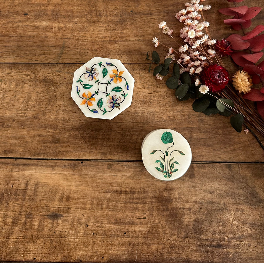 Joli duo de petites boîtes en pierre blanche. Vendues séparément