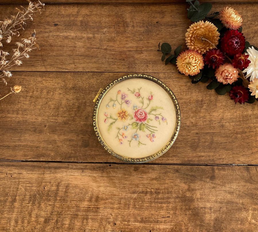 Charmante petite boite à bijoux en dentelle de laiton. On aime particulièrement son couvercle brodé main.