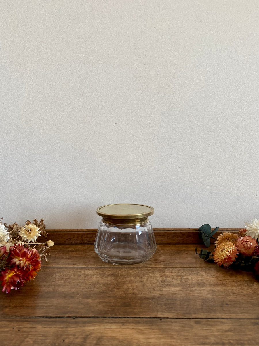 Ancien petit pot à talc en verre avec couvercle plat en laiton gravé d'une petite couronne