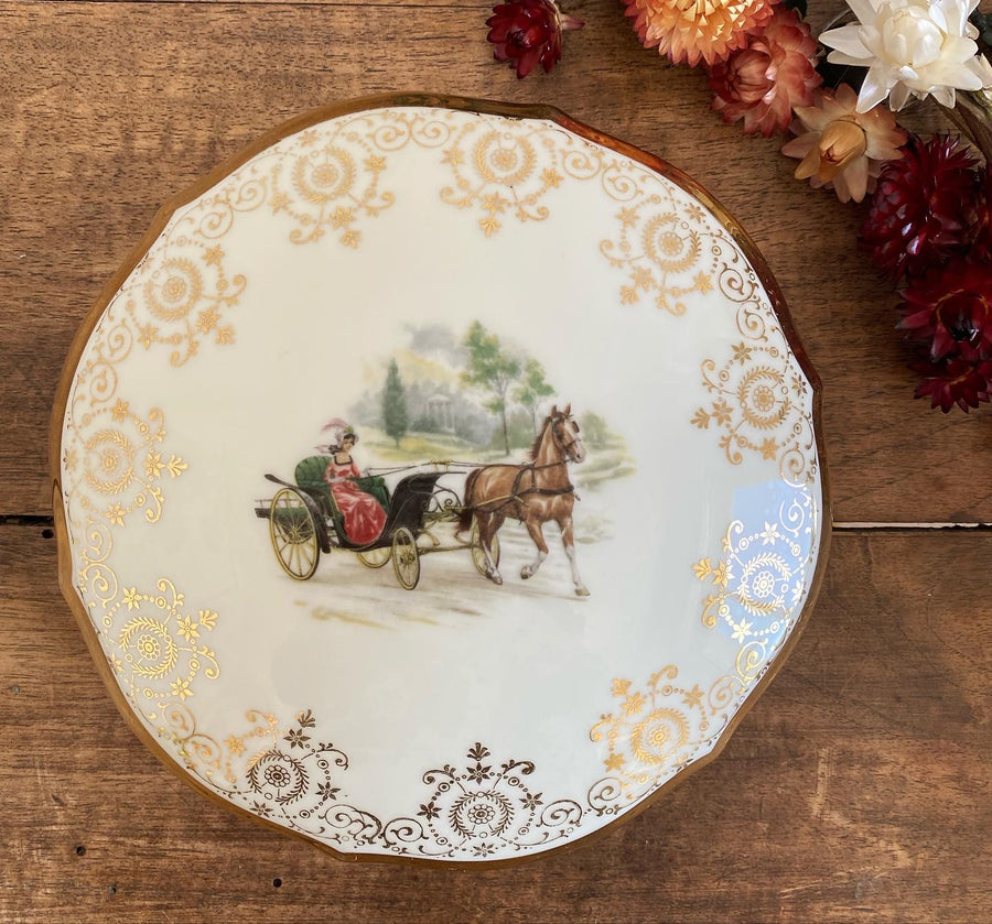 Adorable bonbonnière signée Jammet Seignolles en porcelaine de Limoges avec sa ravissante frise dorée et son joli motif balade en calèche.