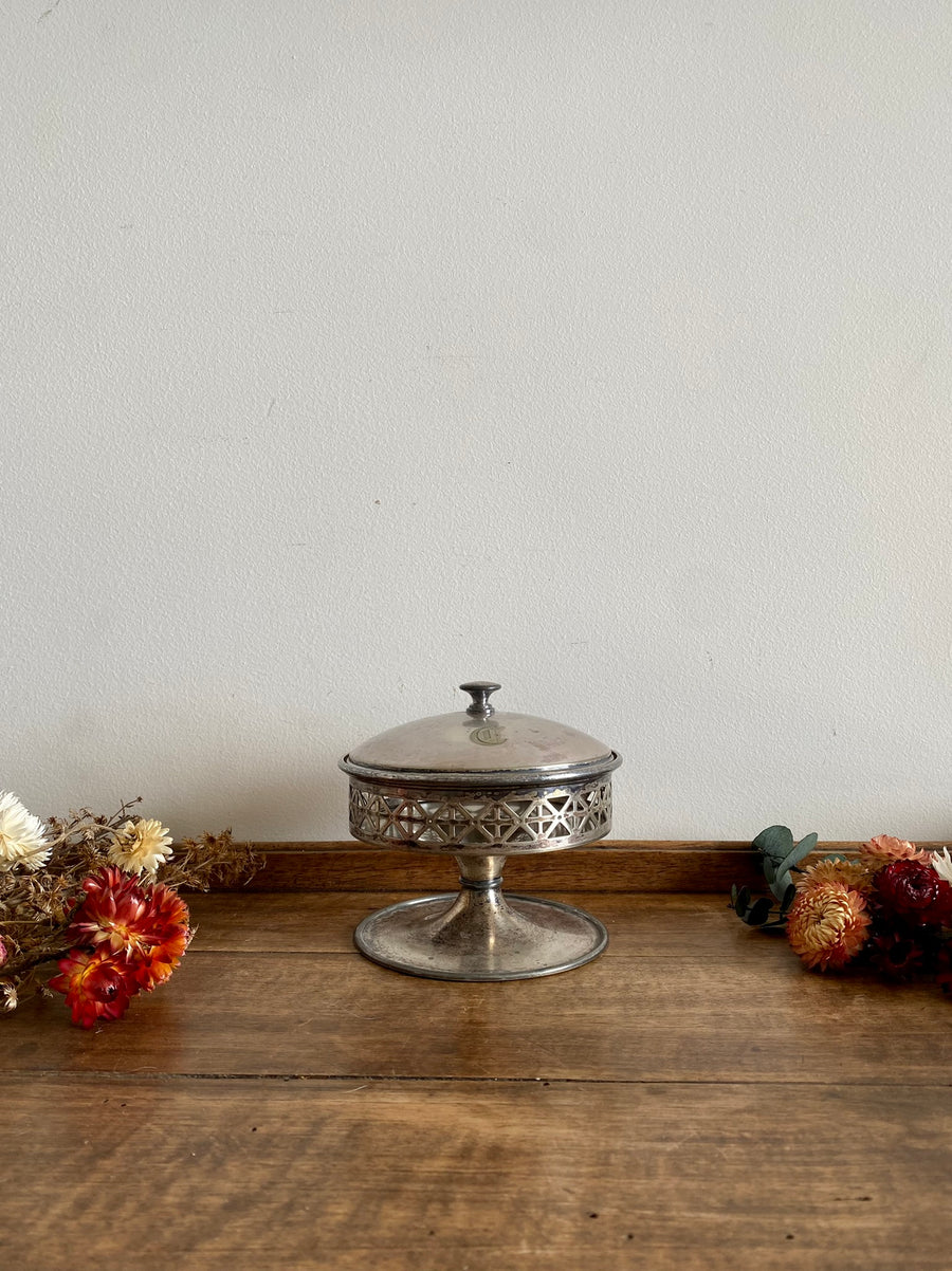 Ravissante bonbonnière en métal argentée ajourée sur pied