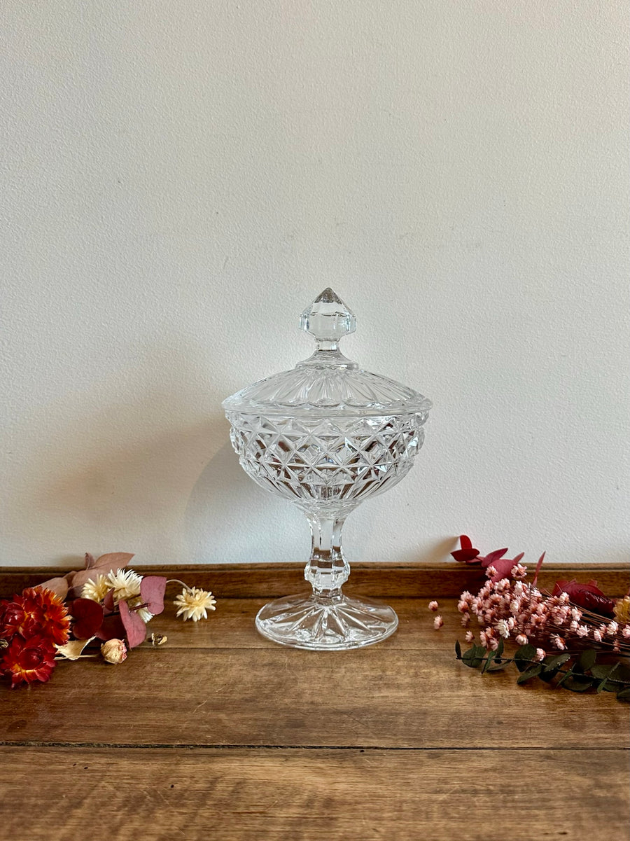 Charmante bonbonnière en cristal travaillé sur pied et munie d'un couvercle. Objet décoratif très élégant !